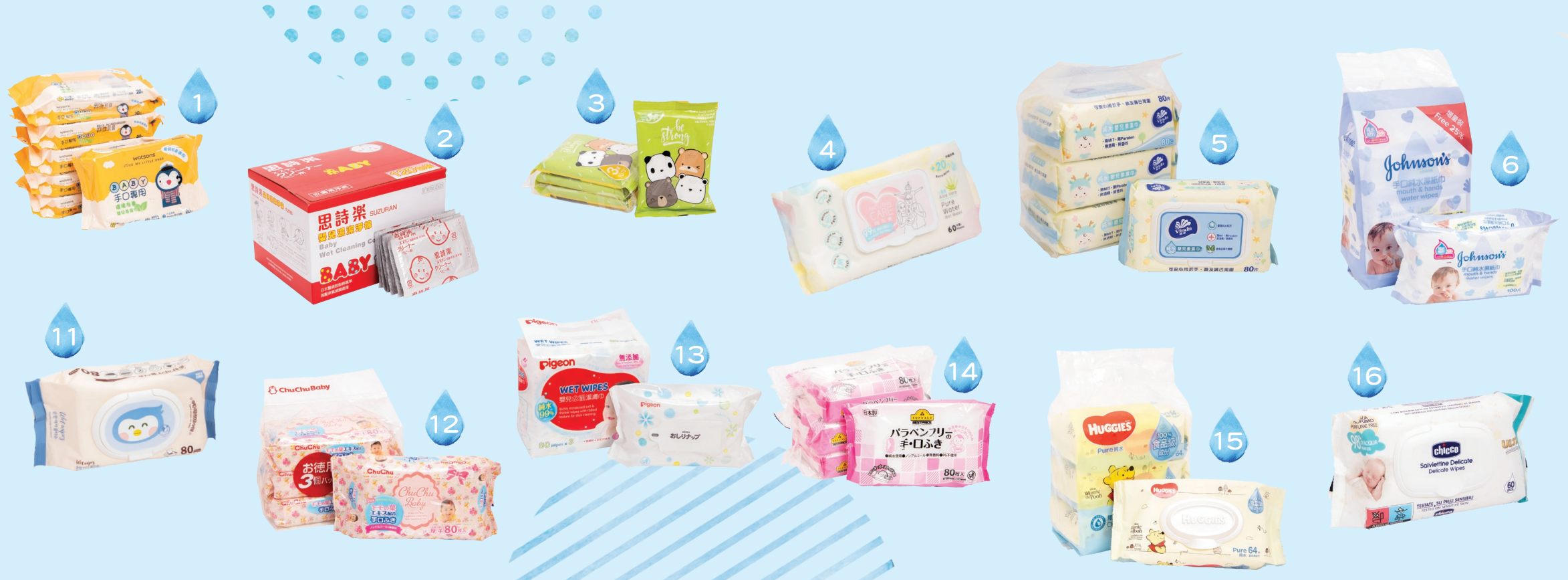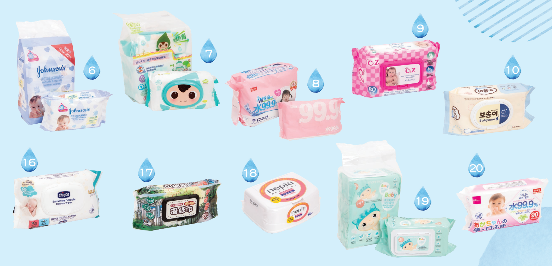測試涵蓋市面上20款較常見的個人護理濕紙巾,全部均沒有消毒效能的聲稱,部分於包裝上標示「純水」、「手口專用」等,大部分聲稱適合用於嬰幼兒。樣本分別購自超市、個人護理用品店或醫療用品店等,除1款屬獨立包裝(每包裝為2張),以及2款屬小包裝(每包裝有10或20張),其餘每包裝有60至100張不等。按各樣本的包裝及售價計算,使用每張濕紙巾需花費$0.12至$0.8,差異可逾5倍半。