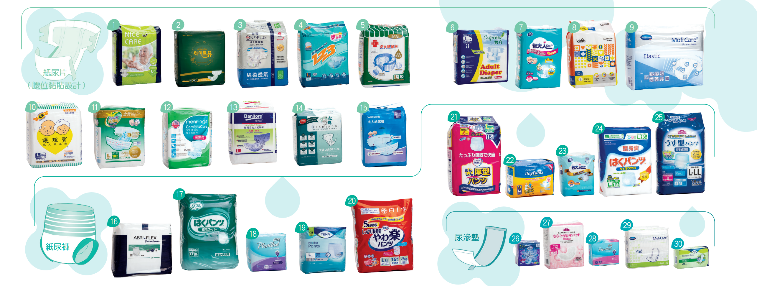 是次檢測共30款樣本,包括15款成人紙尿片、10款穿著式成人紙尿褲及5款尿滲墊。樣本主要購自超市、個人護理用品店、醫療用品店或網上商店。15款尿片的平均售價為每片$4.3至$9.3;10款尿褲的平均售價介乎每條$6.5至$12.5;5款尿滲墊的平均每片售價則為$2.3至$3.9。