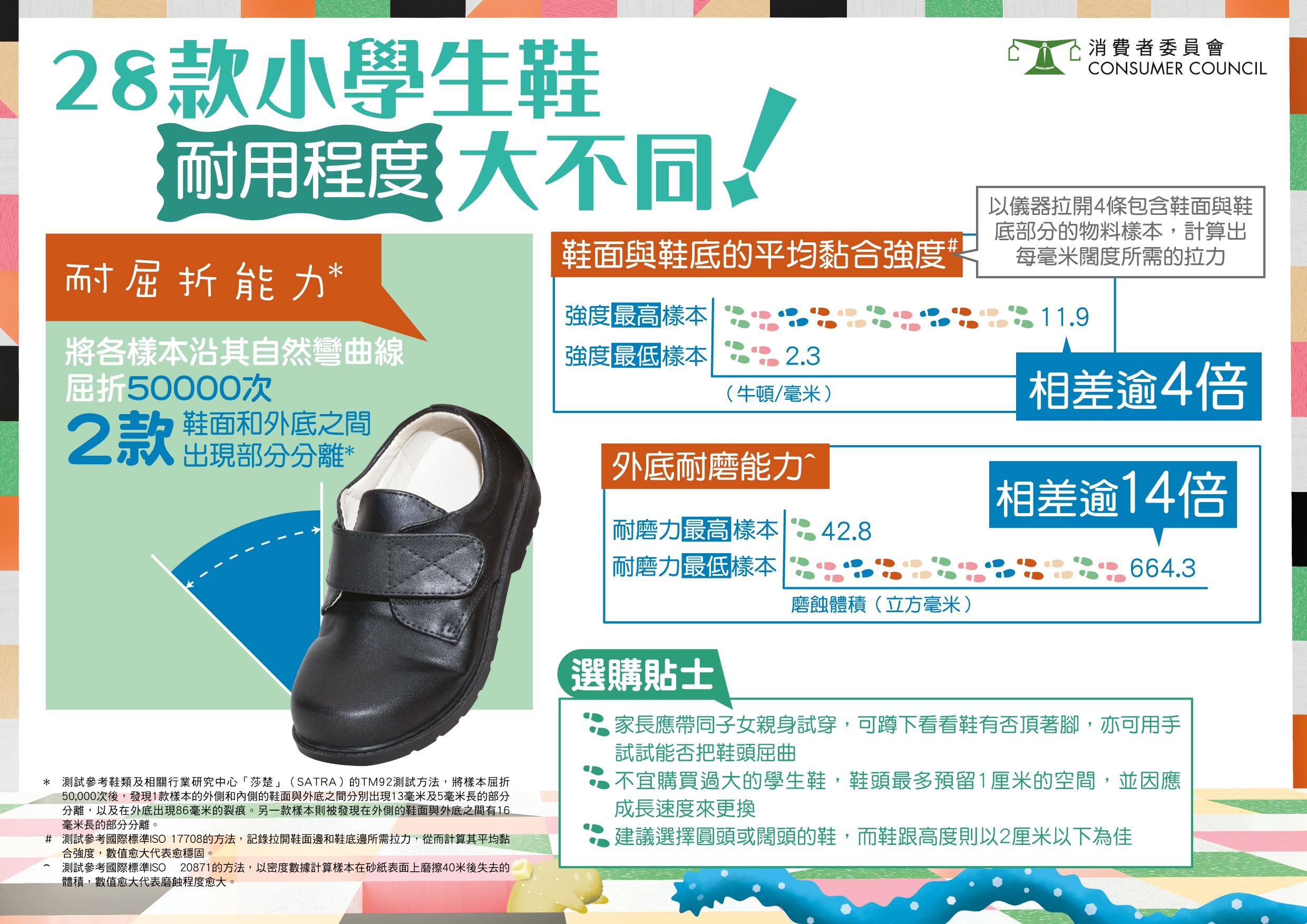 【消委會/學生鞋/小學生鞋/皮鞋/分離/鞋底/耐磨/致癌物/塑化劑/高分/揀鞋/選購貼士/DR. KONG/開學】消委會早前搜購28款小學生鞋,除測試其物理性能,亦檢驗常見的有害化學物質六價鉻、源自偶氮染料的芳香胺、塑化劑和甲醛等的含量。結果發現有樣本檢出六價鉻、塑化劑和甲醛等,更有樣本檢出的含量超出歐盟要求上限。