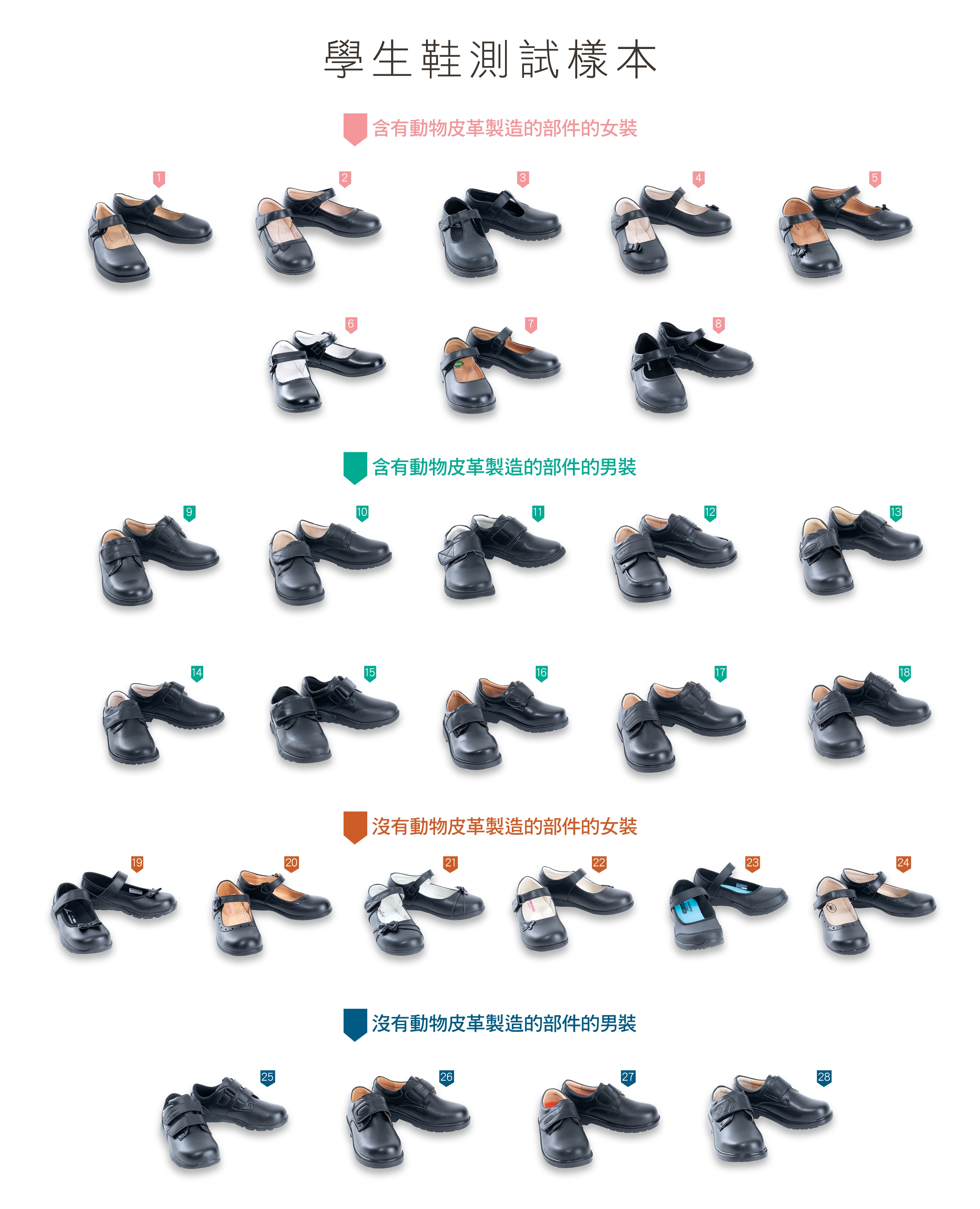 消委會在不同零售點,包括鞋店、服裝店、百貨公司的鞋類專櫃等,購買28款小學生鞋,當中男裝鞋和女裝鞋各佔14款。在有動物皮革成分的樣本中,男裝售價每對$198至$599不等,女裝由$208至$539;而沒有動物皮革成分的樣本中,男裝售價每對$250至$380不等,女裝由$249至$459。