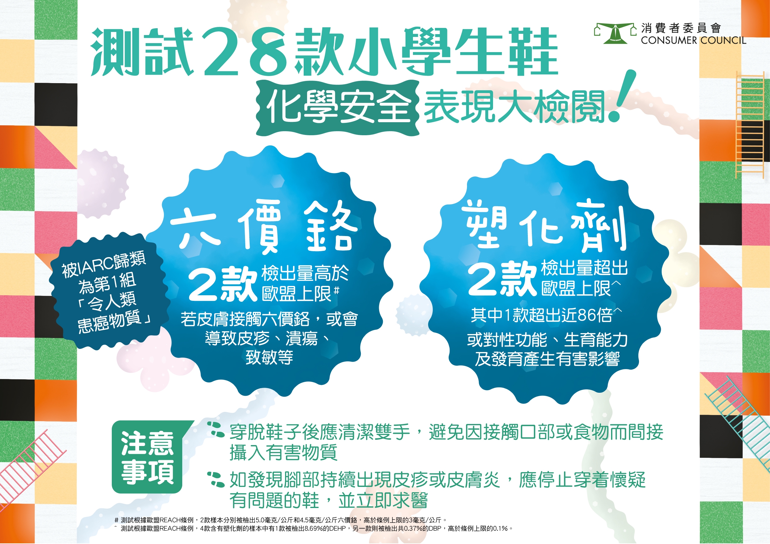 六價鉻已被國際癌症研究機構(IARC)歸類為第1組「令人類患癌物質」。含六價鉻的鞋部件,可能會釋出六價鉻而刺激穿著者的皮膚,穿著襪子亦未必能完全排除接觸到鞋內六價鉻的風險。如家長發現子女的腳部持續出現皮疹或皮膚炎,宜停止穿著懷疑有問題的鞋履,並盡快求醫治理。此外,在觸摸鞋後宜清洗雙手。