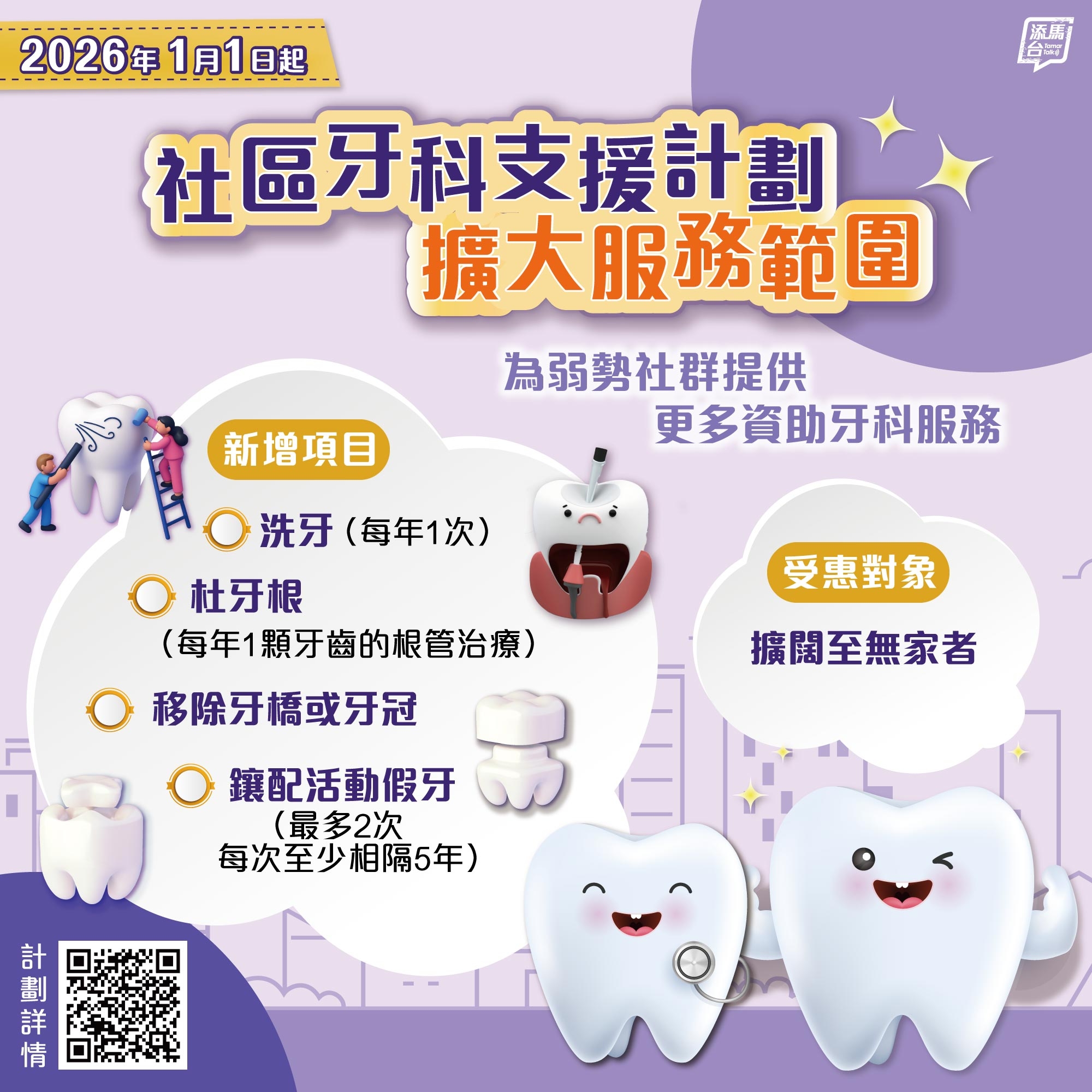 【長者福利/社區牙科支援計劃/長者牙科/長者睇牙/醫療福利/基層醫療/醫務衛生署】醫務衛生署宣布將於2026年1月1日起擴大「社區牙科支援計劃」,新增4項服務,包括:洗牙、「杜牙根」、移除牙橋或牙冠及鑲配活動假牙,這個計劃將取代現有的關愛基金「長者牙科服務資助」項目,劃一收費$50,而部分符合特別資格人士,費用全免、鑲配假牙更降至500元一幅。即入內文睇「社區牙科支援計劃」申請資格、服務項目及費用。
