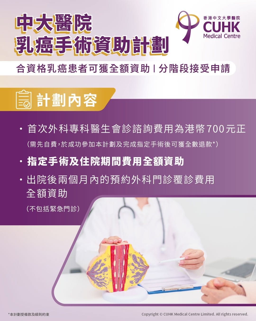 1️⃣ 全額資助指定乳癌手術及住院期間所有費用。