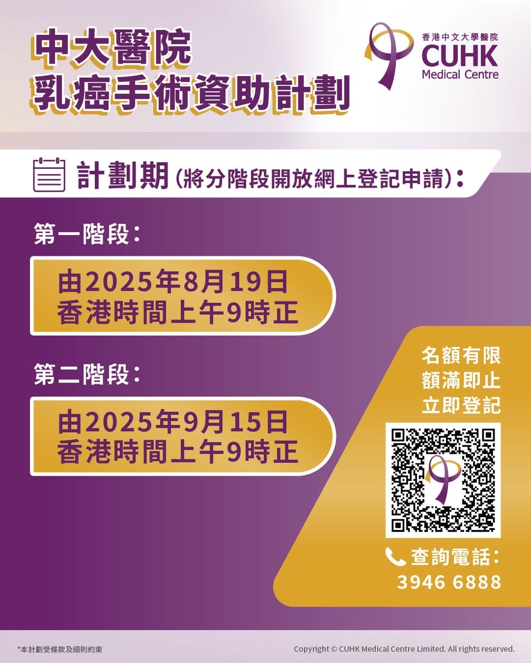 【乳癌/中大醫院/手術資助/免費醫療/免費做手術/癌症治療/乳癌治療/乳癌手術/乳癌患者/中年婦女癌症】根據衞生署衞生防護中心資料顯示,乳癌是本港女性第三位致命癌症。2023年有834名女性因乳癌離世,佔女性癌症死亡人數的13.1%。乳癌患者的年齡中位數為58歲,超過70%的新症患者在50歲以後確診。中大醫院宣布推出「乳癌手術資助計劃」,全額資助乳癌患者的手術費、住院費及出院後的相關費用,旨在減少患者在公立醫院輪候乳癌手術的時間。計劃現正接受申請,以下為具體細節、申請資格及申請方法一覽。