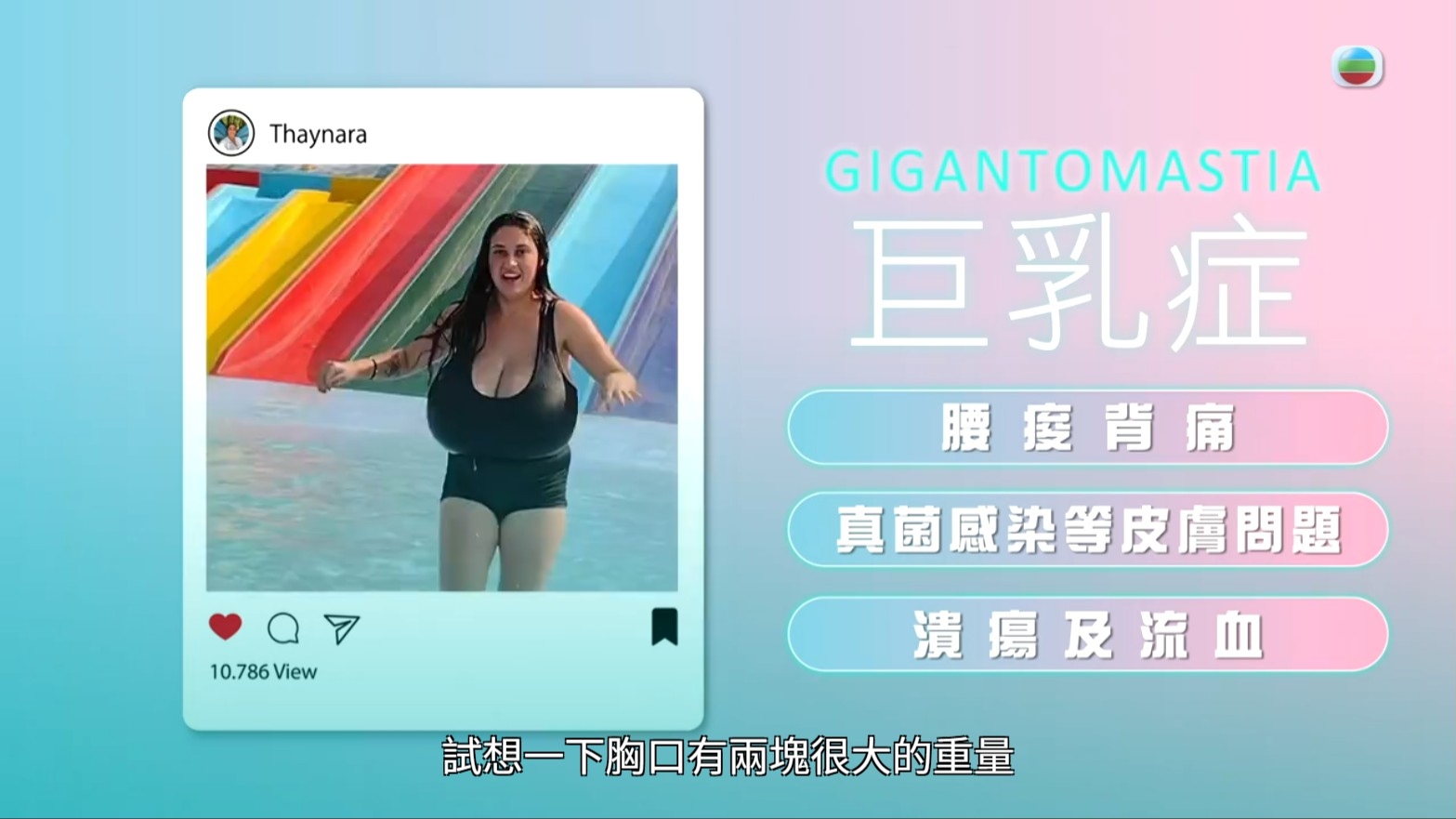 巴西一名22歲少女的胸部去年開始變大,至今年兩邊乳房加起來重12公斤(約26磅),單邊乳房如西瓜一樣大,令她難以買衫和胸圍,更出現肩、頸、背痛,連剪腳甲、綁鞋帶都成問題,購物時更被當成小偷,把東西藏在胸部,原來她是患上巨乳症,需接受縮胸手術,但術後其胸部失去知覺,日後亦無法餵母乳。對此,整形外科專科醫生廖軒麟就為大家拆解巨乳症的定義、成因和影響,詳情可留意周一至五晚10時30分的《健康新聞報道》或到網上重溫節目。