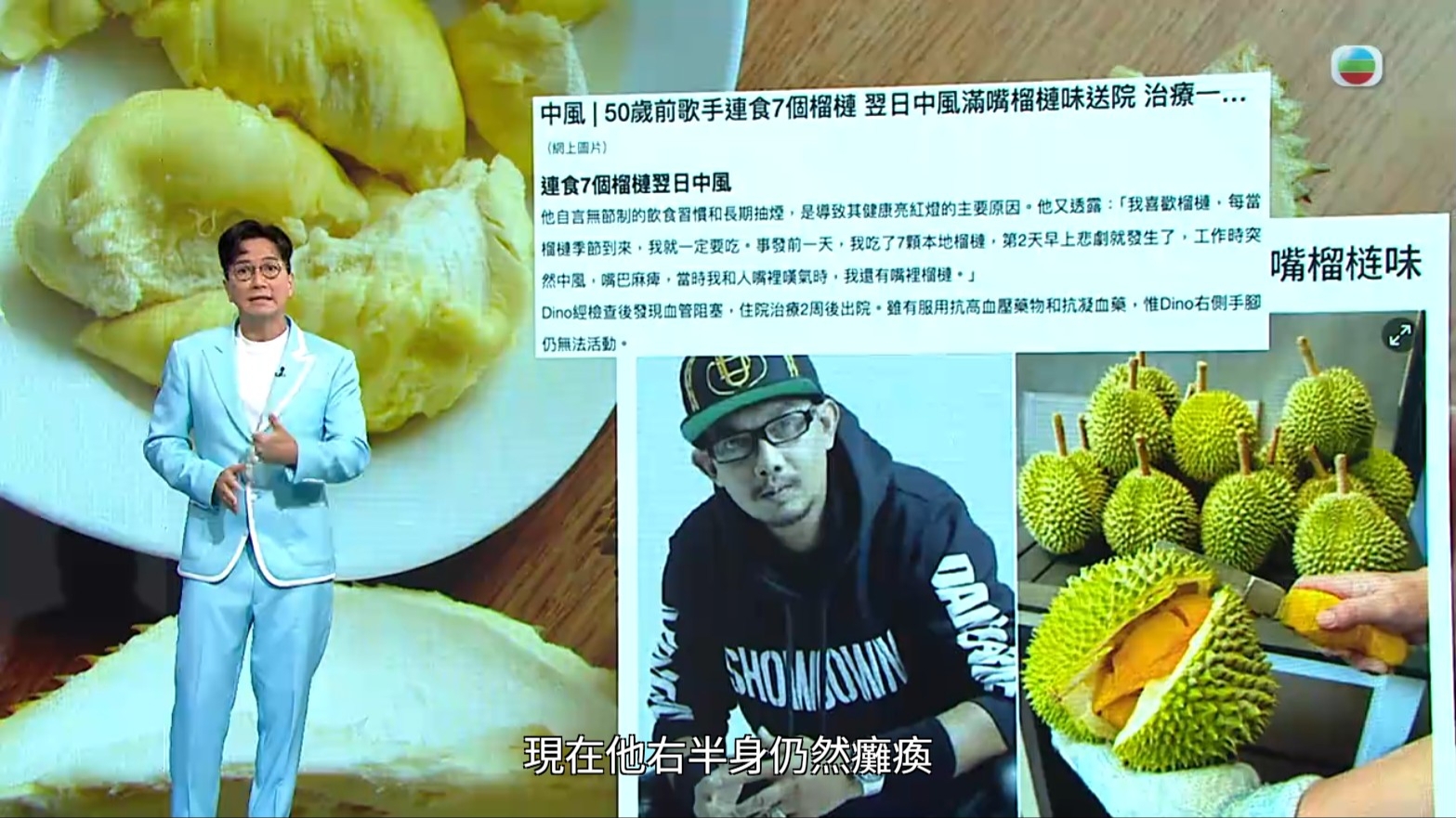 曾為90年代馬來西亞嘻哈團體成員的50歲Dino上月中風,導致半邊身體癱瘓,原來事發前一天他連吃7個榴槤,翌日上班就突然中風、嘴巴麻痺,送院搶救時仍滿口榴槤味。