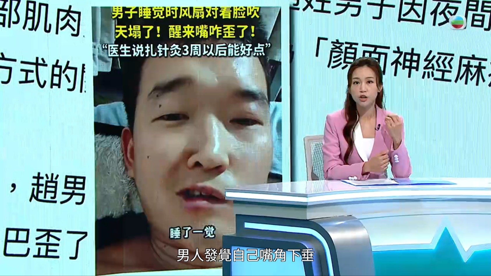 早前遼寧省大連市有一名男子把電風扇放在床邊,朝著頭部吹了一整夜,翌日睡醒後發現嘴角下垂,左邊臉動不了,說話口齒不清,無法控制面部肌肉,檢查後發現是面癱。對此,神經外科專科醫生麥偉傑,就解構面癱和吹風扇之間的關係,詳情可到網上重溫節目。