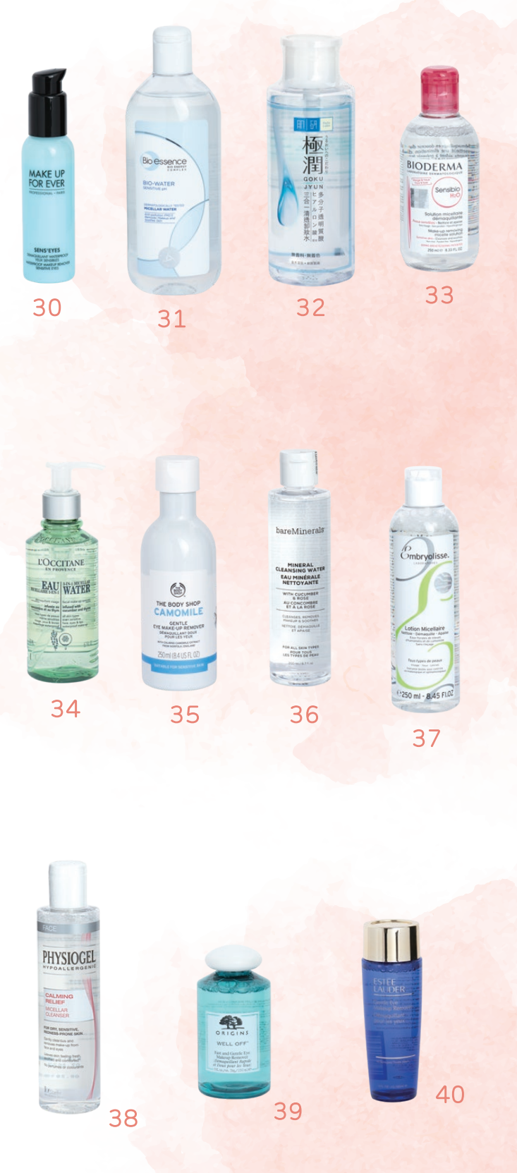 是次測試涵蓋40款不同類型的卸妝產品,當中包括19款水油混合性卸妝液、10款油性卸妝液和11款水性卸妝液。樣本主要購自個人護理連鎖店、百貨公司、化妝品零售店等,每款售價由$48至$355,容量由50至400毫升不等,每毫升售價則由$0.26至$3,相差超過10倍。