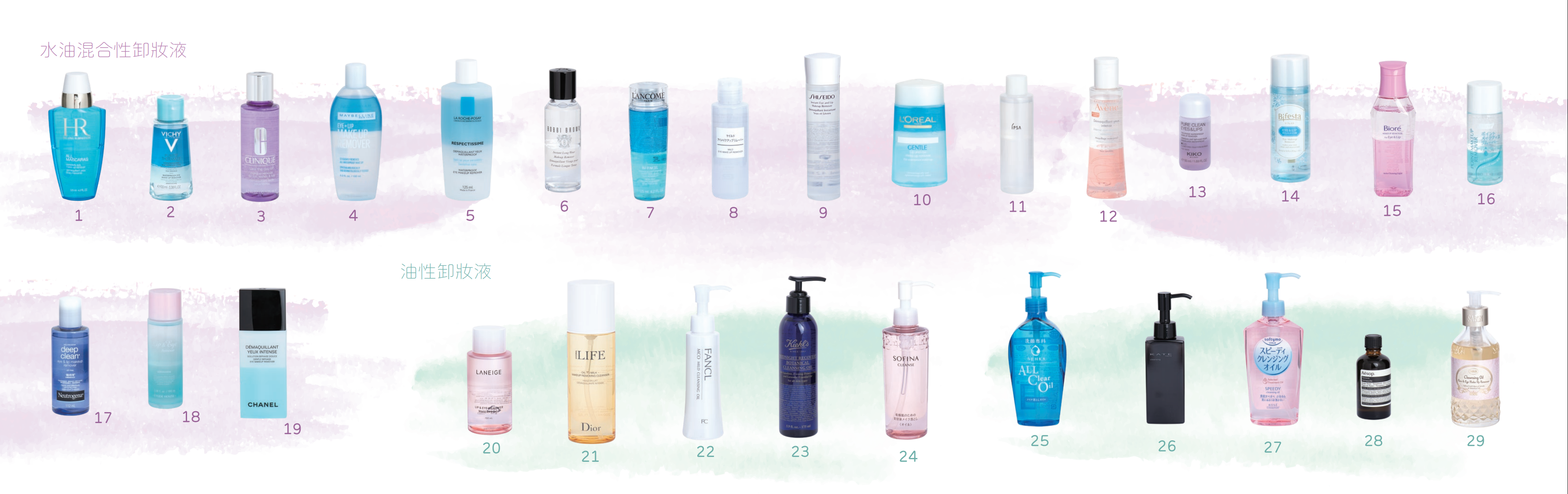 測試結果顯示19款水油混合性卸妝液在卸妝效能的整體表現較佳,當中3款包括「HELENA RUBINSTEIN」、「VICHY Laboratoires」和「CLINIQUE」的卸妝效能指數均達85以上,卸妝表現突出。另有5款的卸妝效能指數達80以上,包括「MAYBELLINE New York」、「La Roche-Posay」、「BOBBI BROWN」、「MUJI」和「Bioré」,卸妝表現亦相當不俗。