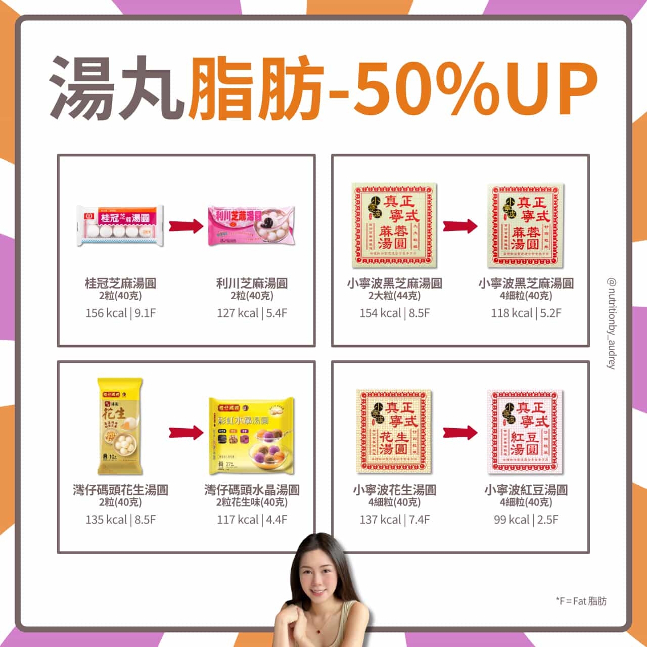 Audrey表示,3粒湯圓的熱量等於1碗飯加1茶匙油,就算餡料一樣,脂肪量都可以相差1倍多。