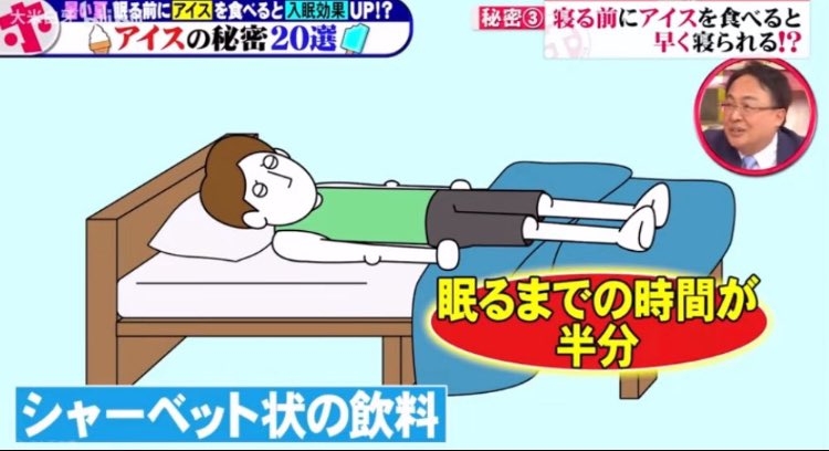 日本社交平台與媒體盛傳「睡前吃冰降腦溫、促進快速入睡」。有網友認為冰品冷感可讓大腦降溫,但醫學觀點普遍指出,暫時口腔降溫並不足以改善腦部溫度。「沒有任何可靠學術論文證明睡前吃冰能改善睡眠,反而可能增加健康風險」。
