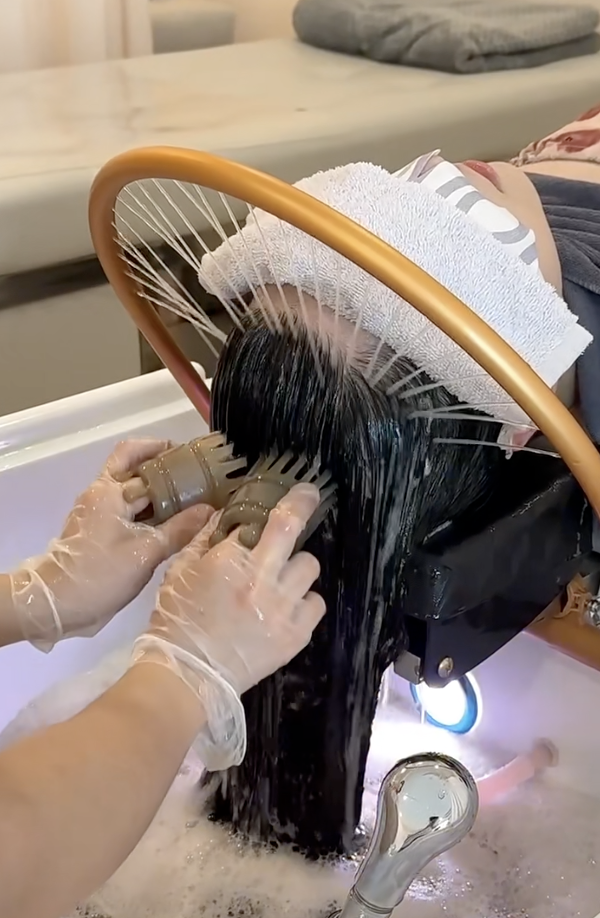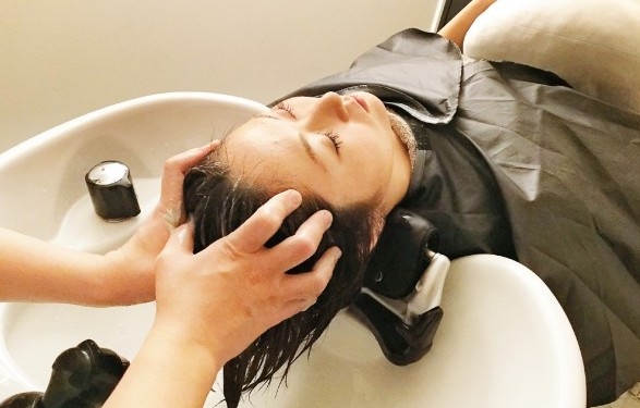 - 請髮型師調整洗頭水槽高度,並在頸部下方墊毛巾支撐。