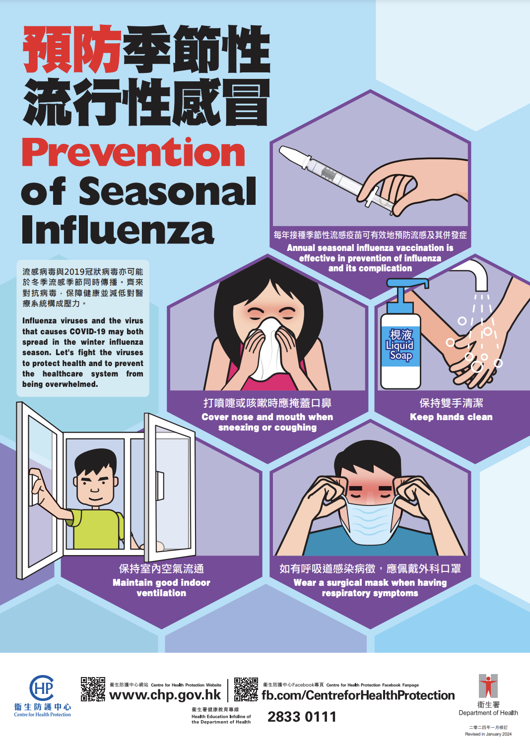 指流感疫苗是預防最有效辦法。建議六個月以上人士(包括兒童、長者、慢性病患者)優先接種,即使去年已接種,仍要按年更新疫苗對抗變種。