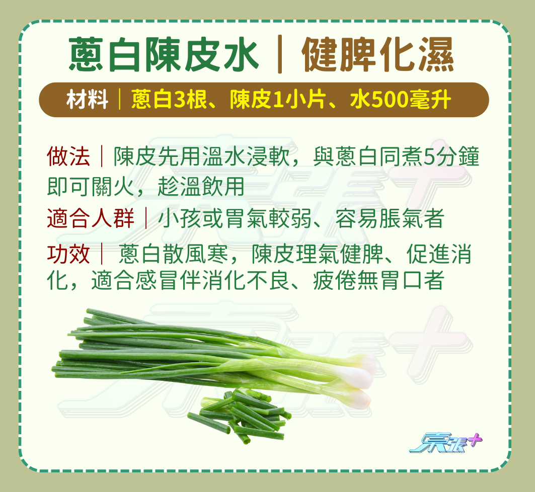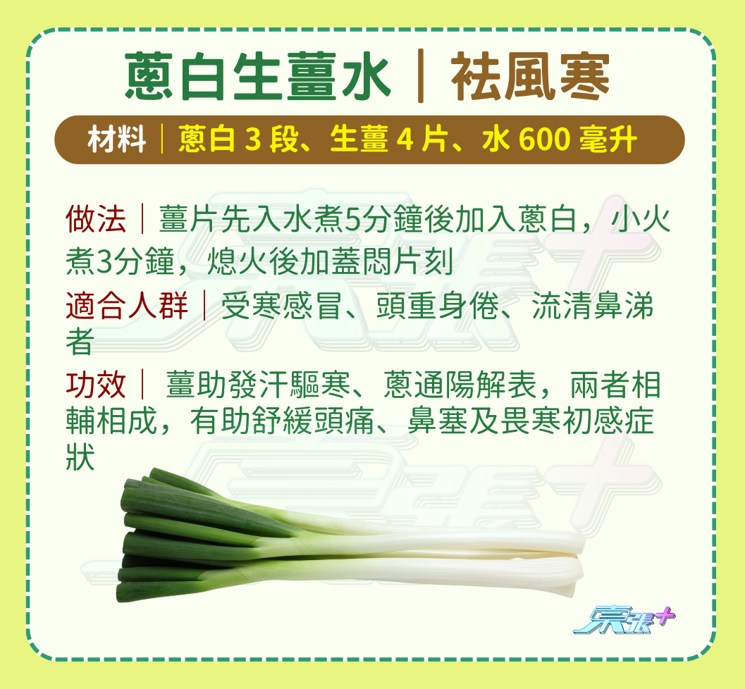 功效: 薑助發汗驅寒、蔥通陽解表,兩者相輔相成,有助舒緩頭痛、鼻塞及畏寒初感症狀。