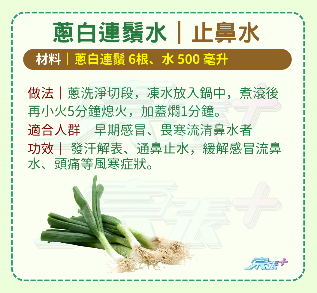 🟢 中醫表示,蔥白味辛、性溫,有「發汗解表、通陽散寒」功效,能促進身體毛孔開泄、幫助出汗,以驅除風寒,清除鼻竅中冷氣滯塞,達到止鼻水與通鼻的效果。
