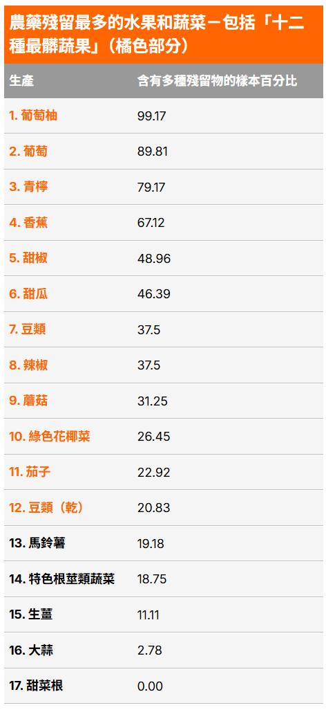 農藥可致癌症、生殖問題今年該機構在測試的17種水果和蔬菜中,發現123種不同的化學物質,其中包括42種與癌症有關的殺蟲劑。另有21種化學物質已知會干擾荷爾蒙系統,可能導致出生缺陷、發育障礙和生殖問題。