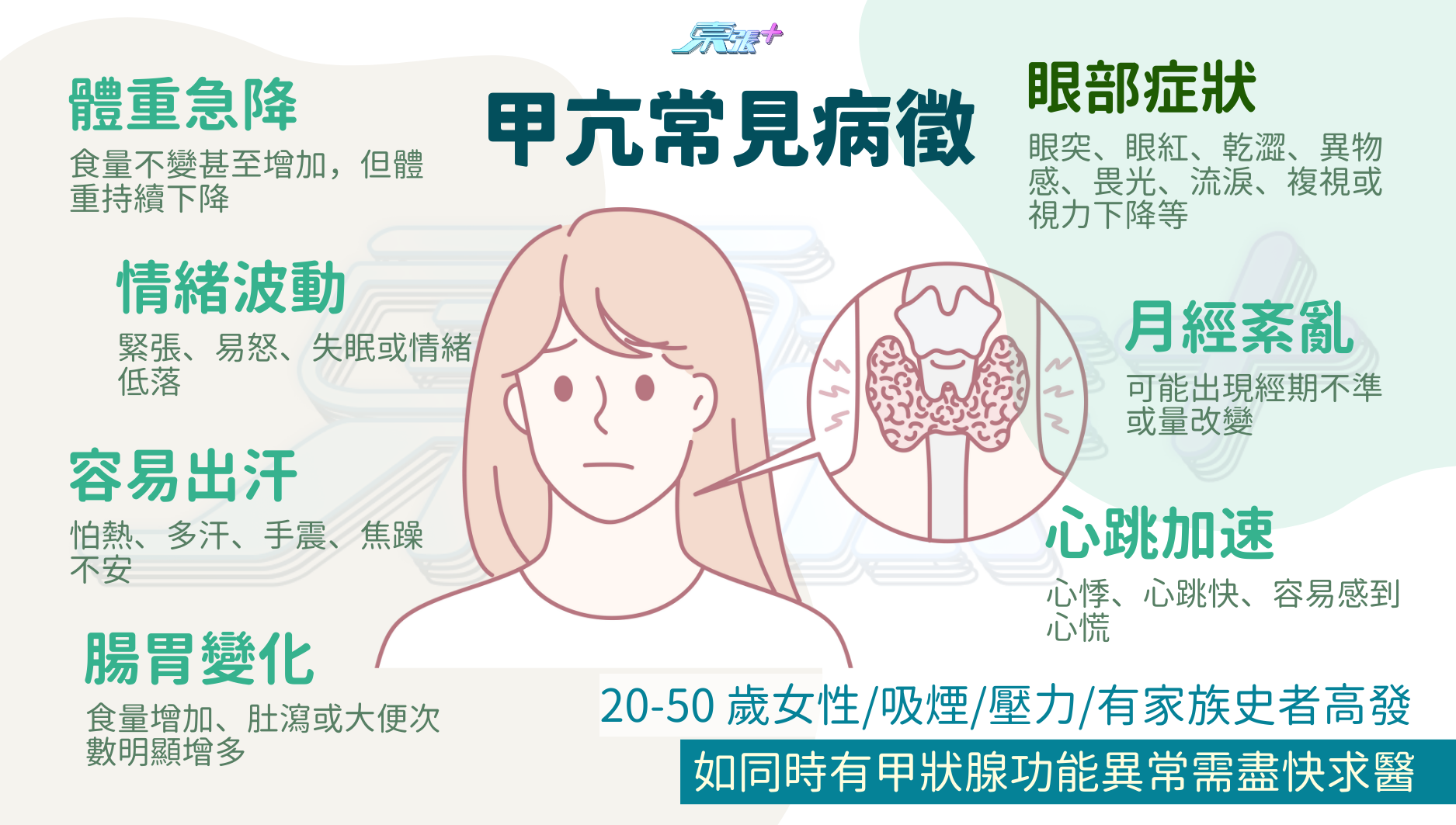 - 容易出汗:怕熱、多汗、手震、焦躁不安