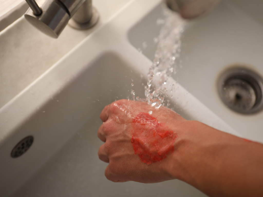 用流動的冷水沖燙傷處至少10至20分鐘,能迅速降低皮膚溫度,減少組織損傷。越快降溫,疼痛和紅腫就越輕。