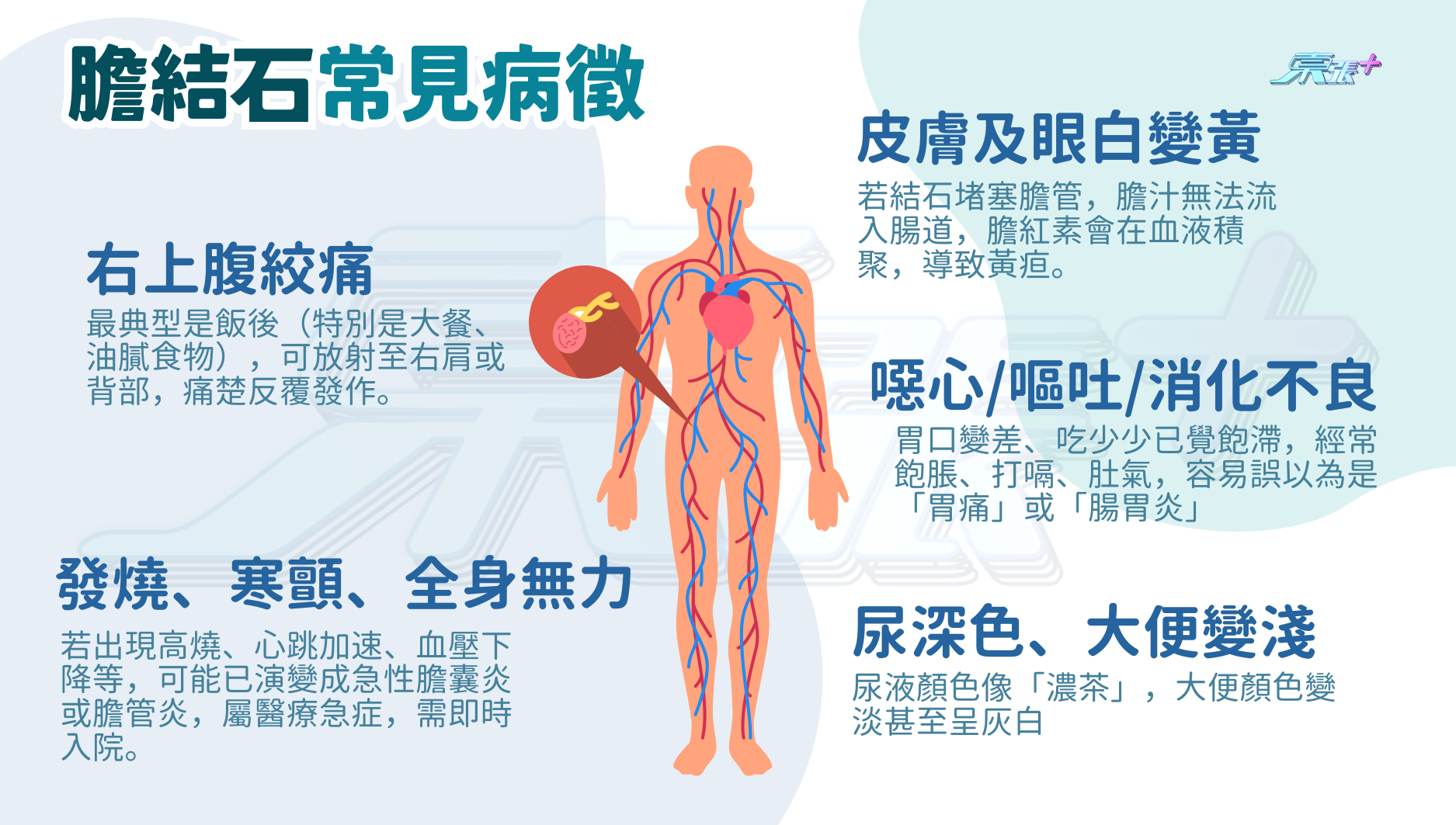 • 發燒、寒顫、全身無力:若出現高燒、心跳加速、血壓下降等,可能已演變成急性膽囊炎或膽管炎,屬醫療急症,需即時入院。
