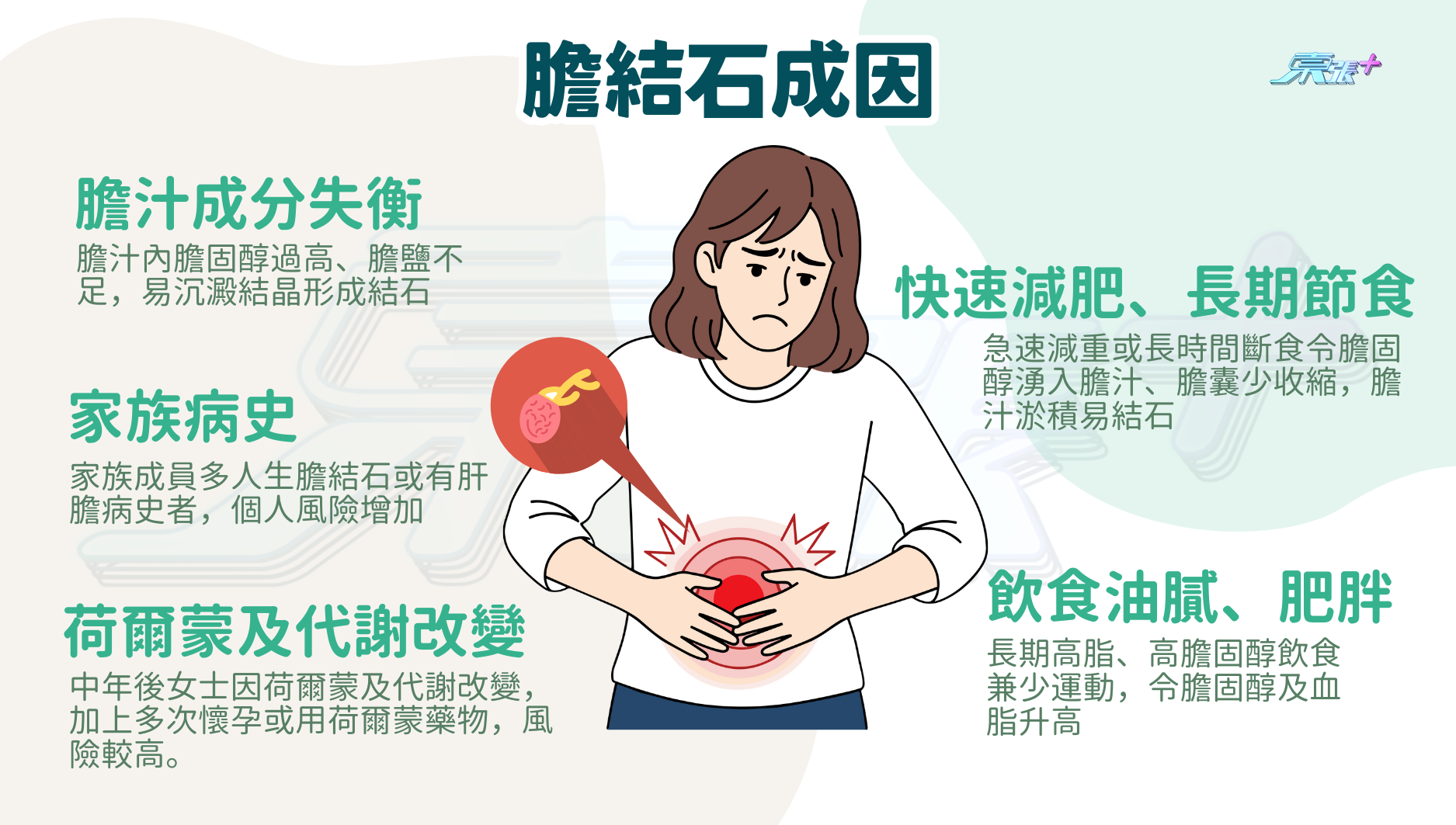 • 快速減肥、長期節食:急速減重或長時間斷食令膽固醇湧入膽汁、膽囊少收縮,膽汁淤積易結石。