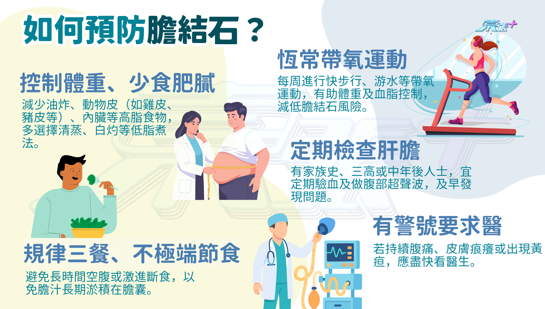• 定期檢查肝膽:有家族史、三高或中年後人士,宜定期驗血及做腹部超聲波,及早發現問題。