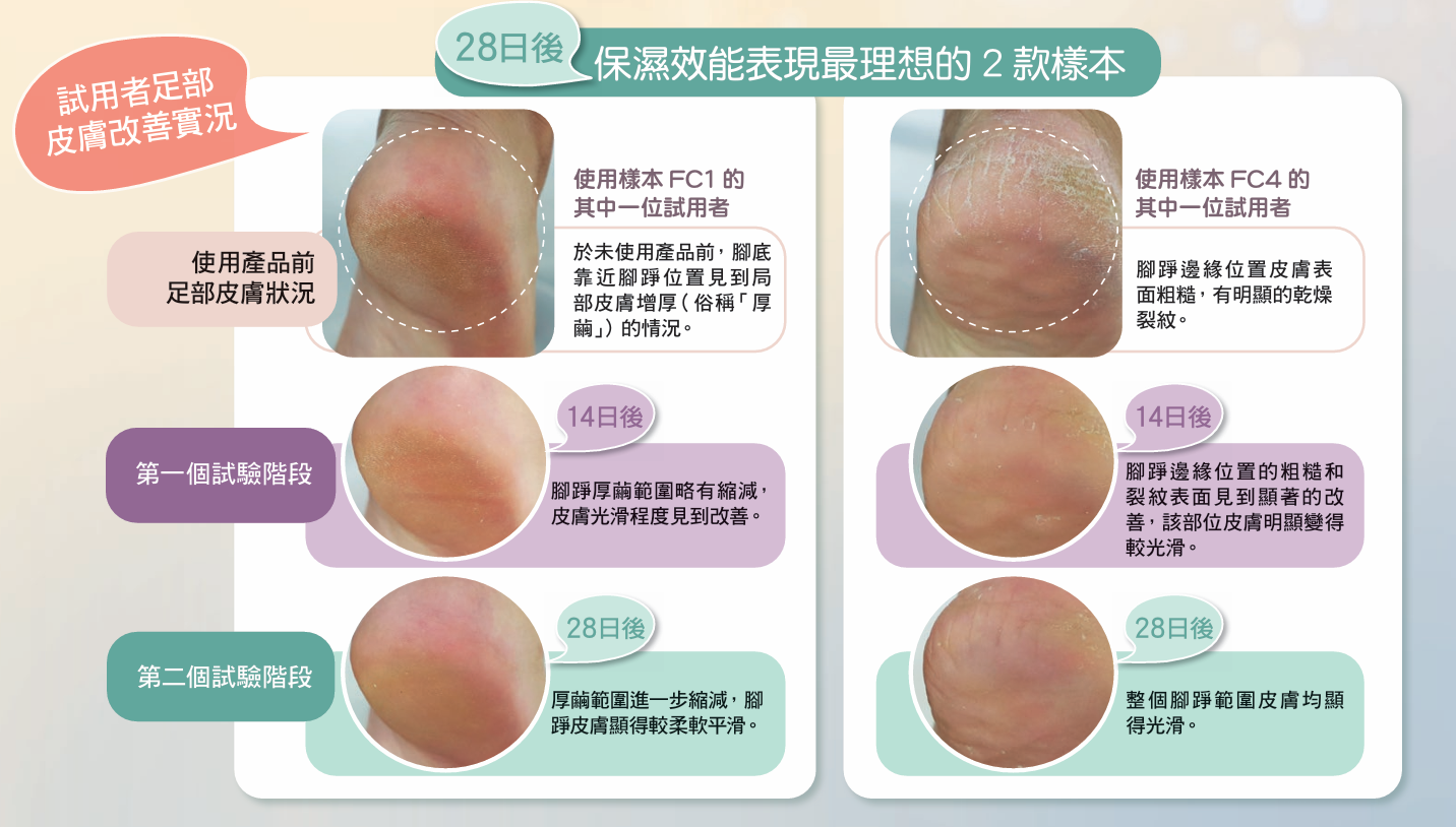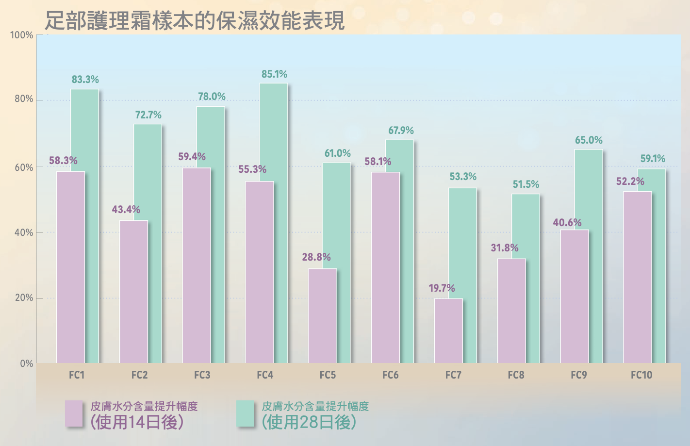 試驗結果顯示,大部分試用者在使用各款足部護理霜14日後,腳踭皮膚位置量度所得的皮膚水分含量都有顯著的提升,當中以「SABON」、「Dr. Scholl」、「ORIGINS」、「安潔 Aiken」和 「Baby Foot」的保濕效能相對較突出,試用者在使用該等樣本14日後,皮膚水分含量平均提升超過50%。