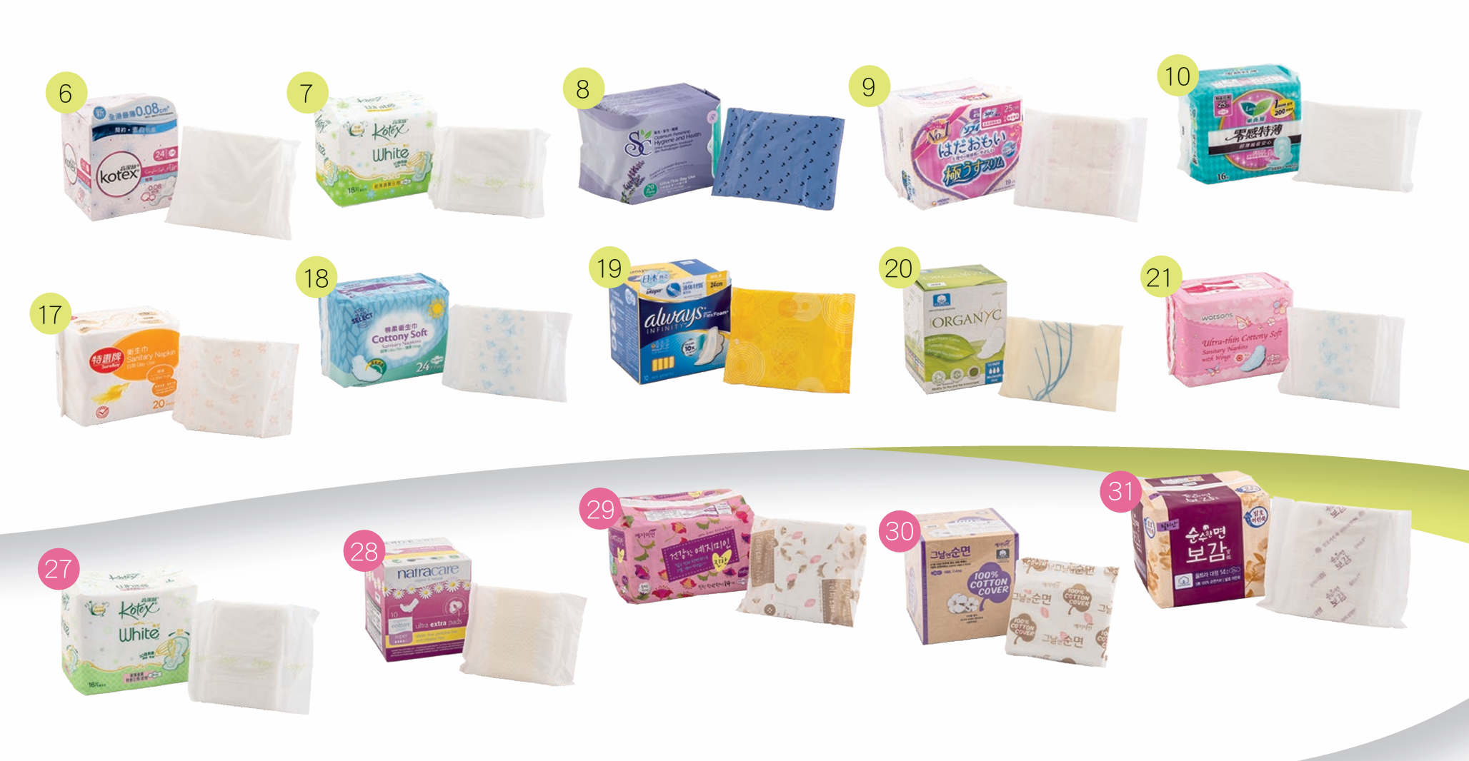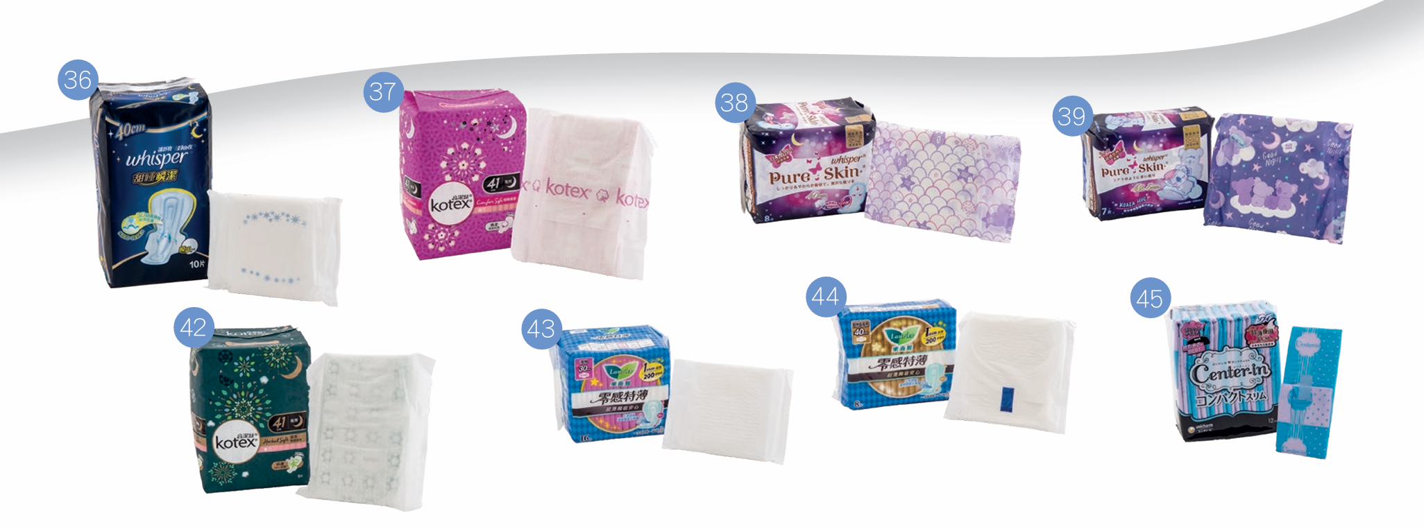 45款中,21款聲稱為適合日用、供中等流量,或聲稱巾身長度介乎23至25厘米;10款為供日用/夜用,或長度由26至29厘米;其餘14款則為夜用,長度由29至42.5厘米。樣本購自百貨公司、超市、個人 護理用品店等,21款日用型號的平均售價為每片$0.42至$4.99,售價最高和最低相差近11倍;10款日用及夜用的平均售價介乎每片$1.68至$4.90;夜用平均每片售價則為$1.24至$4.58。