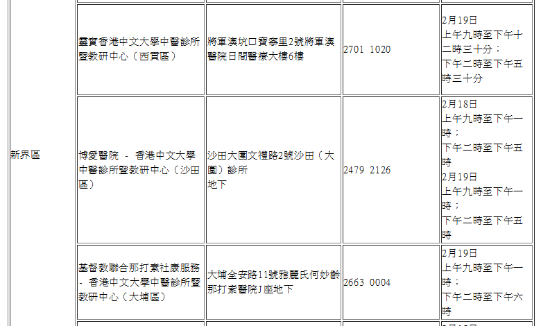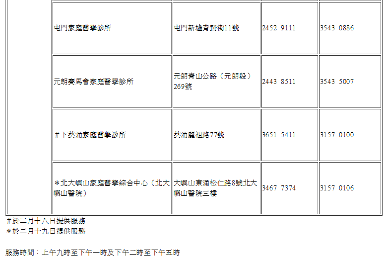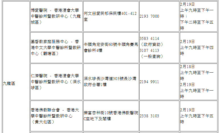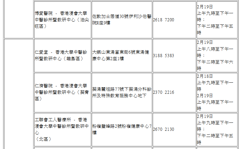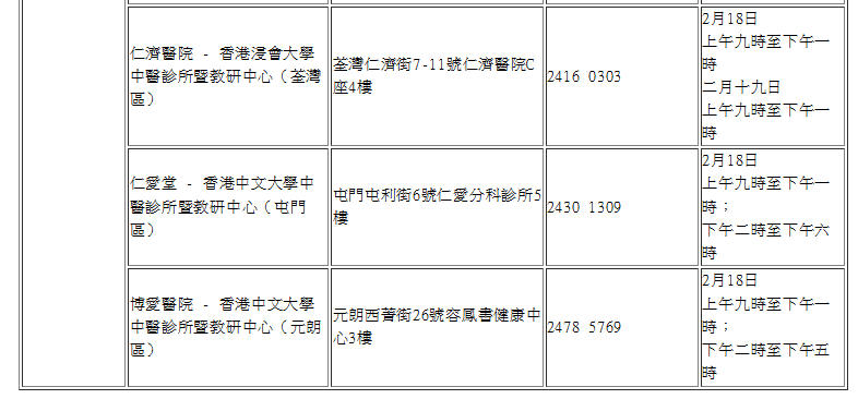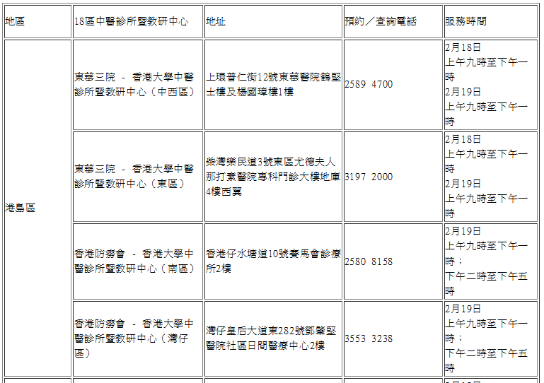 農曆新年假期期間(2月18日至19日)18區中醫診所暨教研中心服務安排