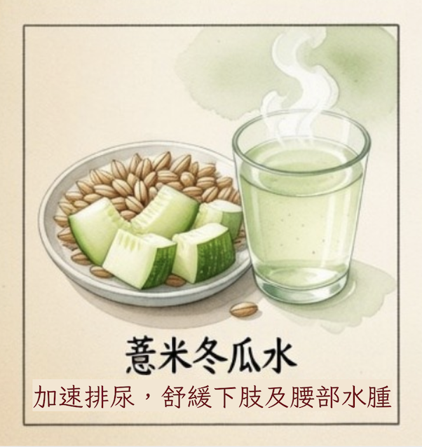 - 功效重點:加速排尿,舒緩下肢及腰部水腫,亦可幫助清熱解暑。冬瓜本身利水消腫,配薏米效果更顯著。