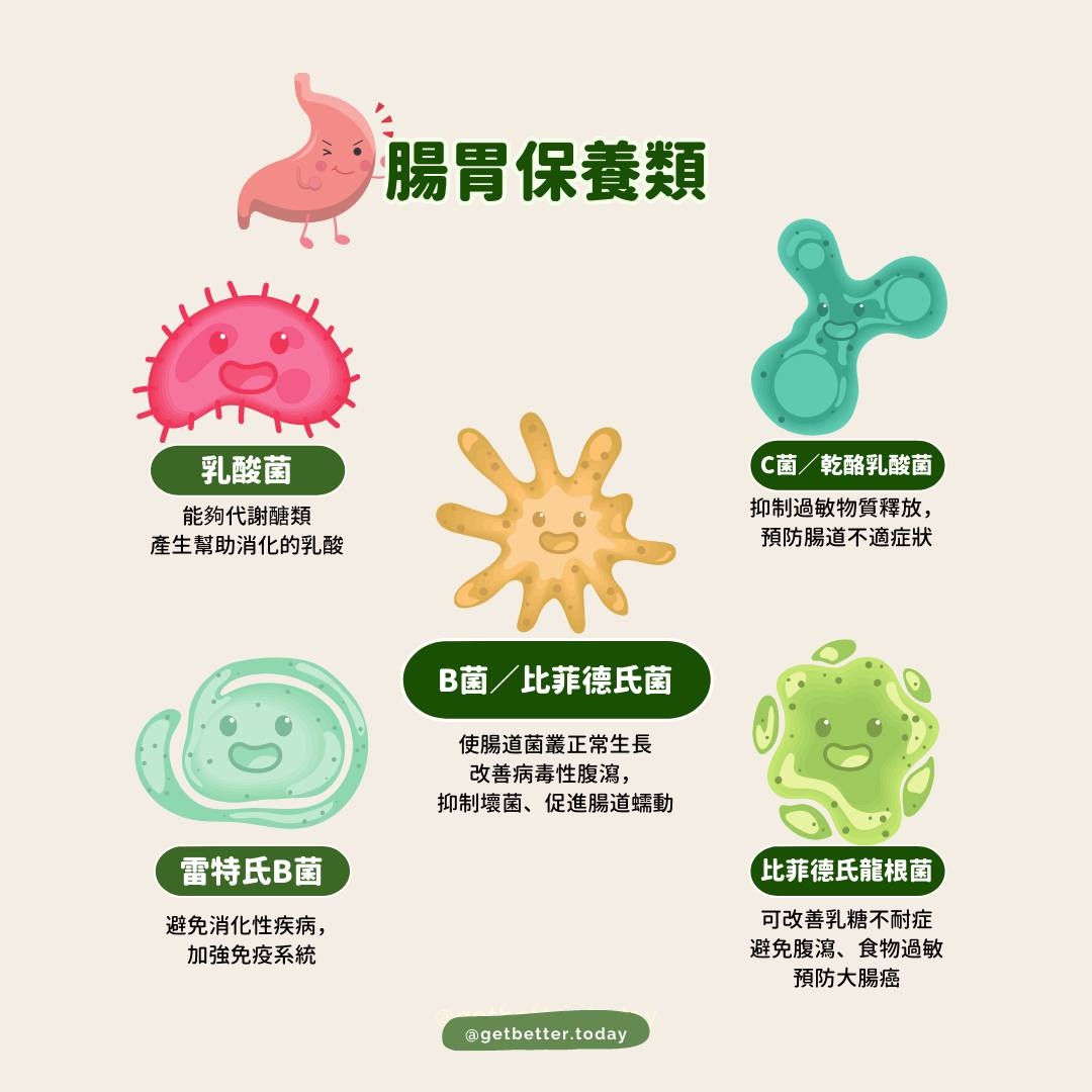 3.C菌(乾酪乳酸菌):C菌能預防腸道不適,提升免疫力,使腸道菌叢正常化。