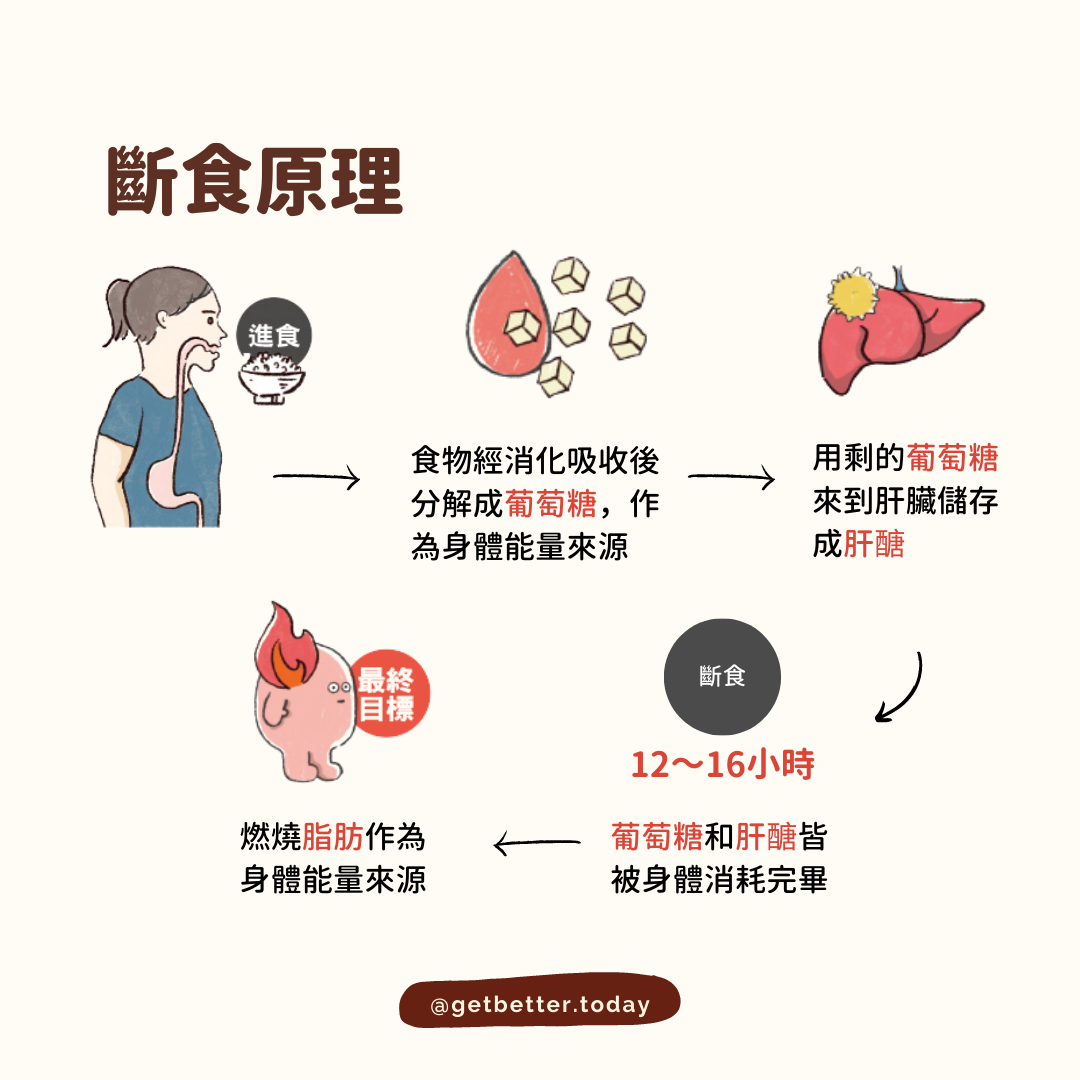 斷食法最重要係斷食「時間」要夠,先可以進入「燃脂」段期!喺呢個段期內,葡萄糖和肝醣被身體耗盡後,就會啟動燃燒脂肪作為身體能量來源,呢個時間你就開始減肥啦~