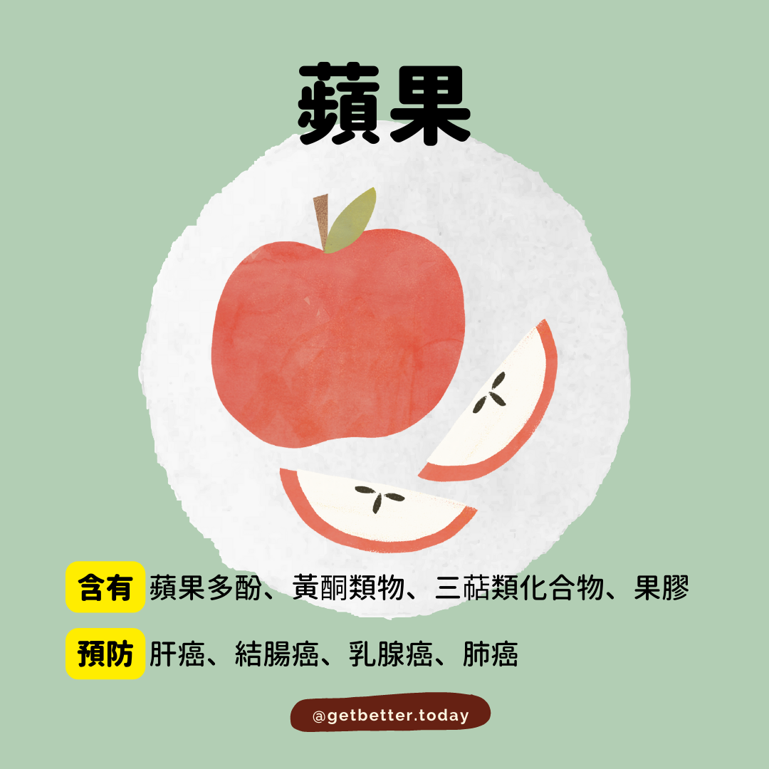 蘋果富含多種營養成分。 經常食用可以有效降低患肝癌、結腸癌和乳腺癌的風險。 蘋果中的蘋果多酚和類黃酮等天然抗氧化劑可以降低患冠狀動脈疾病和肺癌的風險。 三萜類化合物具有調節血壓、降血脂、保護肝臟、抑制癌細胞腫瘤等作用。 蘋果中的果膠能清除人體胃腸內的細胞,破壞癌細胞生長所必需的酶,抑制癌細胞的增殖。
