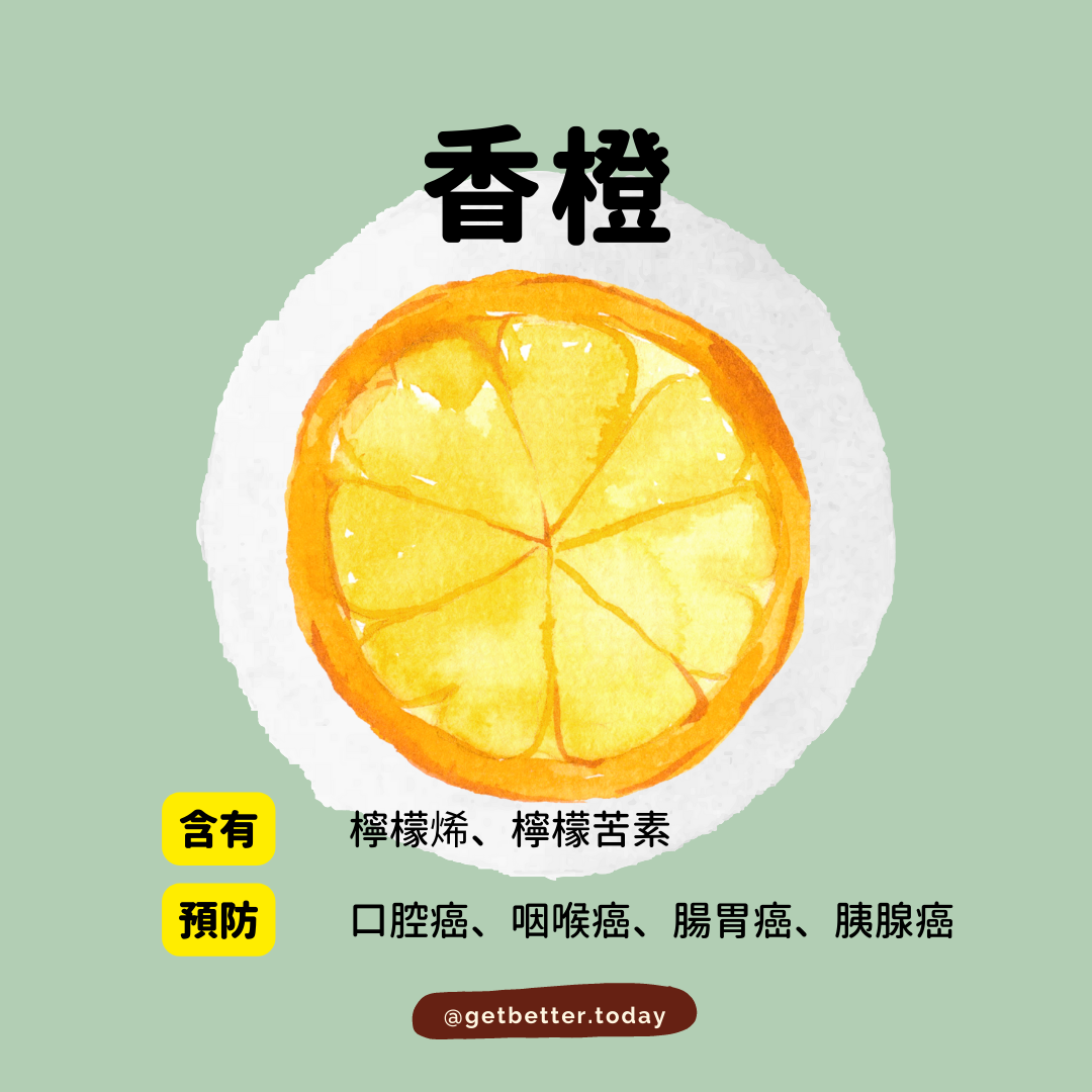 醫學研究發現,經常食用#橙 可以降低口腔癌、咽喉癌、胃癌和胰腺癌等癌症的發病率。 橘子皮含有檸檬烯,能促進呼吸道黏膜分泌,有助祛痰止咳平喘,並能抑制癌症。 細胞生長,檸檬苦素能使穀胱甘肽與致癌物質結合,使之成為無毒物質排出體外。