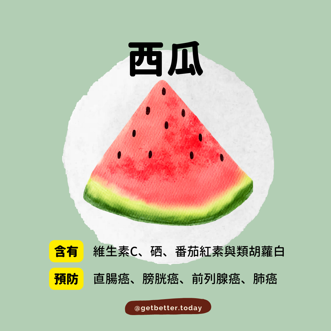 現代醫學研究表明,西瓜含有多種人體所需的營養物質和有益物質,如維生素C、硒、番茄紅素和類胡蘿蔔素等強效抗氧化劑,可預防直腸癌、膀胱癌、前列腺癌、肺癌、 等作用。
