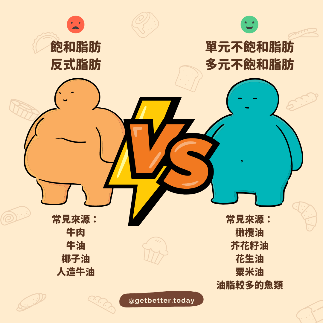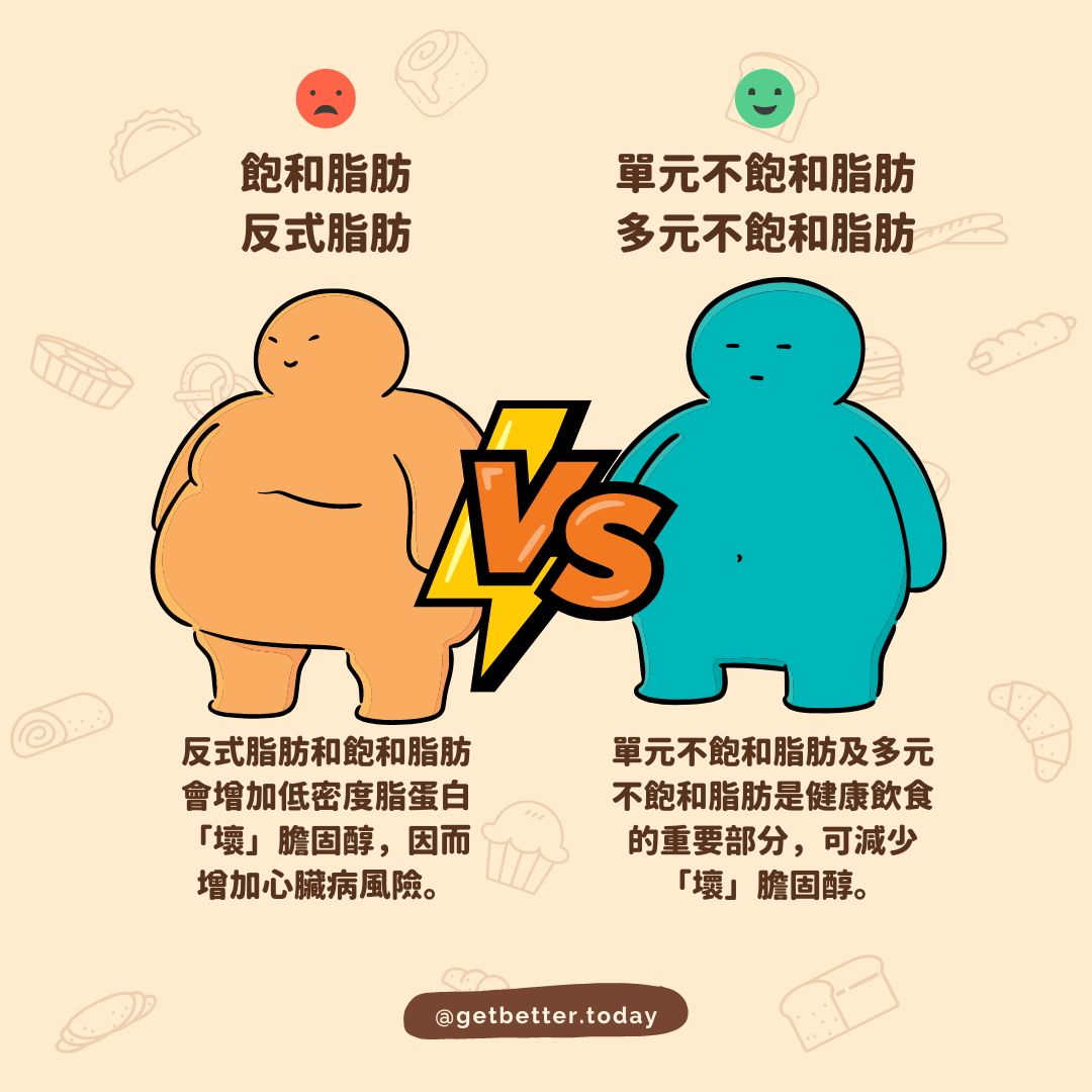 飽和脂肪同反式脂肪會增加低密度脂蛋白(「壞」) #膽固醇,因而增加心臟病風險。而反式脂肪更加會減少高密度脂蛋白(「好」)膽固醇,必須避免!反式脂肪通常會喺牛肉羊肉及奶製品中搵到少量,工業生產的食品例如人造牛油、植物起酥油及烘焙/油炸食品就有超級大量!!