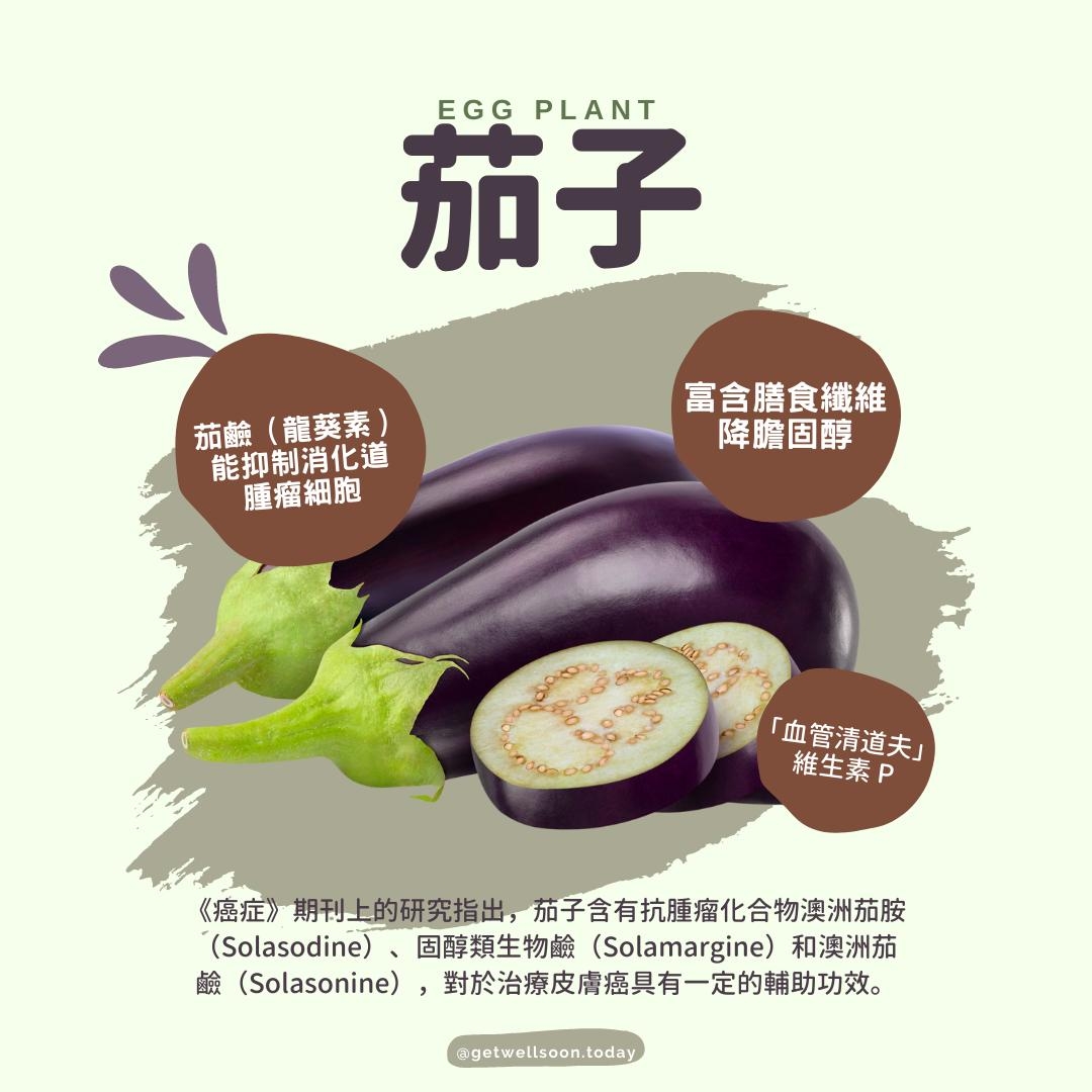 《癌症》期刊上的研究指出,茄子含有抗腫瘤化合物澳洲茄胺(Solasodine)、固醇類生物鹼(Solamargine)和澳洲茄鹼(Solasonine),對於治療皮膚癌具有一定的輔助功效。
