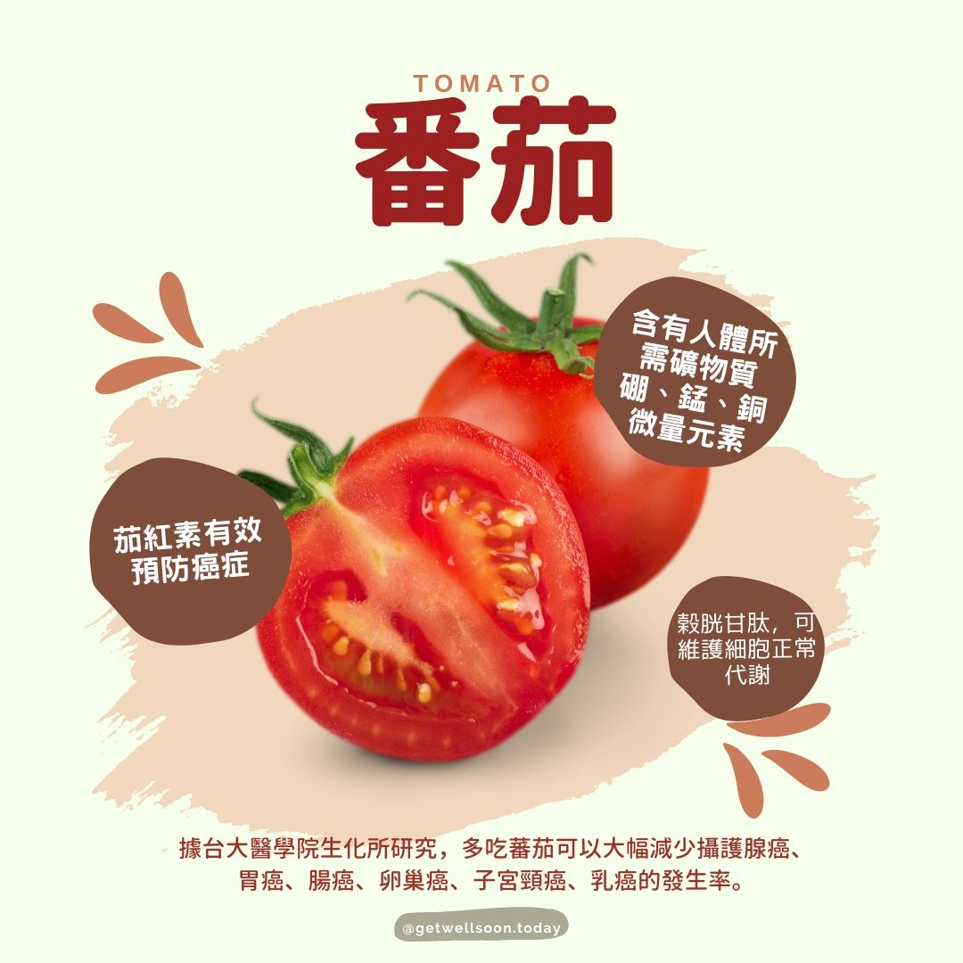 據台大醫學院生化所研究,多吃蕃茄可以大幅減少攝護腺癌、胃癌、腸癌、卵巢癌、子宮頸癌、乳癌的發生率。