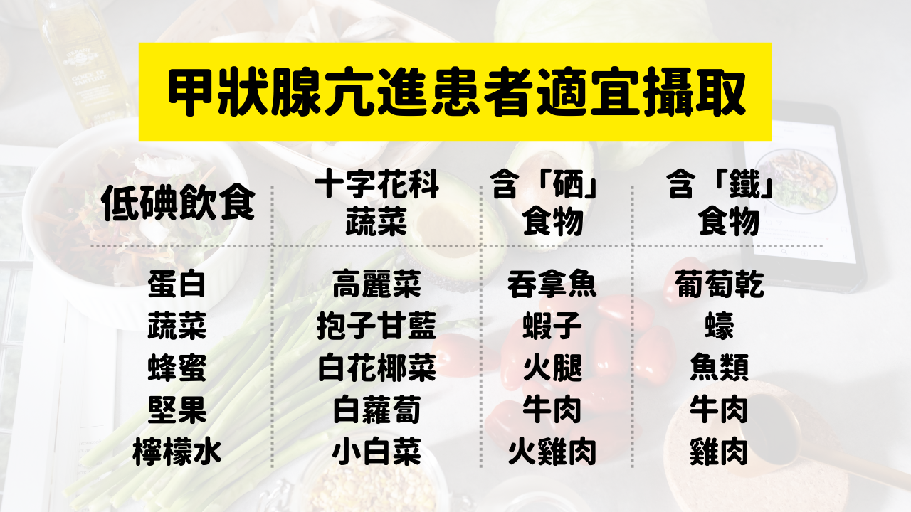3. 飲食調理:初期代謝速率偏高,飲食需求量較高,應選擇營養豐富的高蛋白食物。避免過度攝取油膩、甜味和重口味的食物,如肥肉、香腸、胡椒等,以免助熱、助濕、生痰和加重症狀。同時,應避免菸酒、咖啡、油炸物、辛辣和刺激性食物,以及碘含量較高的海產品。