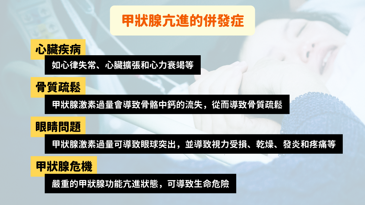 胡依諾醫生表示,甲狀腺亢進可能會引起許多併發症,包括:![]()