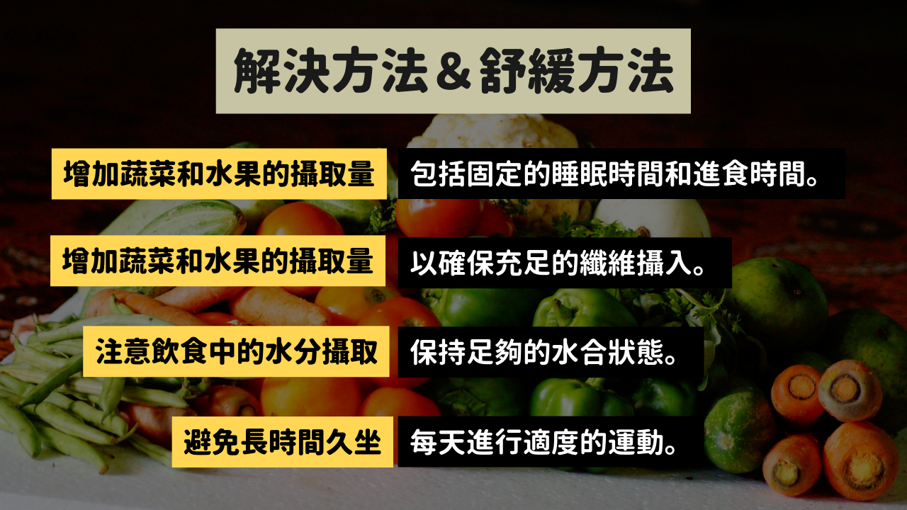 避免便秘的關鍵是保持健康的生活習慣和飲食習慣。除了上述的解決方法,以下是一些建議: