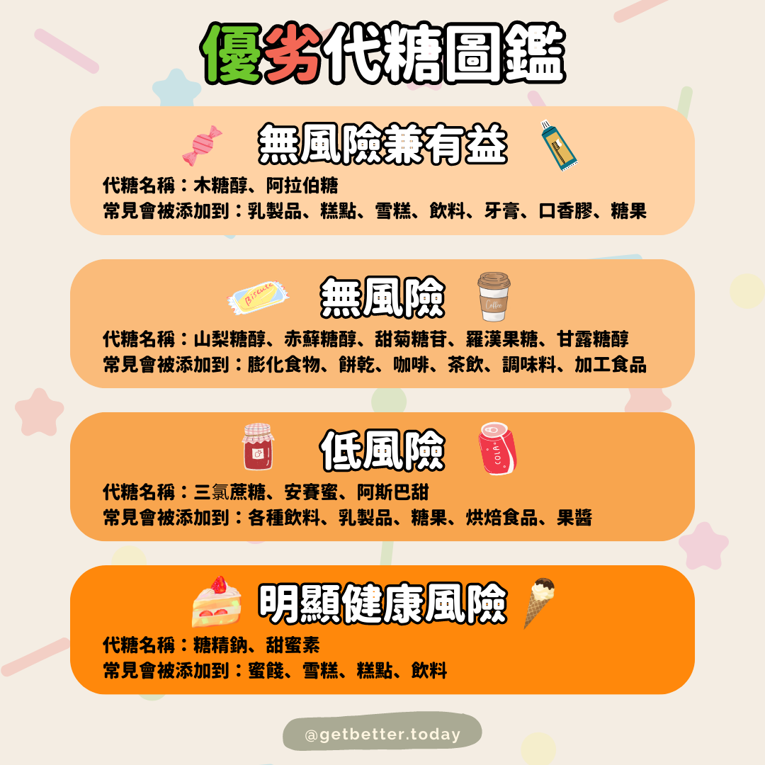 根據衛生部的數據顯示,目前的實證研究結果表明,代糖不會致癌,美國食品藥物管理局(FDA)也沒有明確證據顯示代糖與人體致癌之間的關聯。代糖都經過國內外多年的研究和試驗,才被允許使用。台灣也制定了使用規範及標準,若業者遵照規範,應不會導致身體不適。且使用甜味劑的食物,大多為零食而非主食,因此,民眾從飲食中攝入代糖,導致危害健康的機會不大。