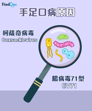 手足口病是由多種腸病毒引致,常見的是柯薩奇病毒 (Coxsackievirus)。另外,腸病毒71型 (Enterovirus 71,簡稱EV71)所引致的手足口病,可引致嚴重併發症。