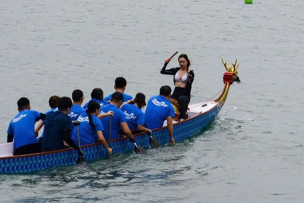 這位穿著比基尼在龍舟前打鼓的女鼓手,當時她與朋友去參加香港「海泓龍舟」的訓練比賽,而當天比賽的是小龍舟賽事,這位美女被分配到龍頭女鼓手的位置,當時因為天氣太熱,才會拉開拉煉,沒想到會意外爆紅。