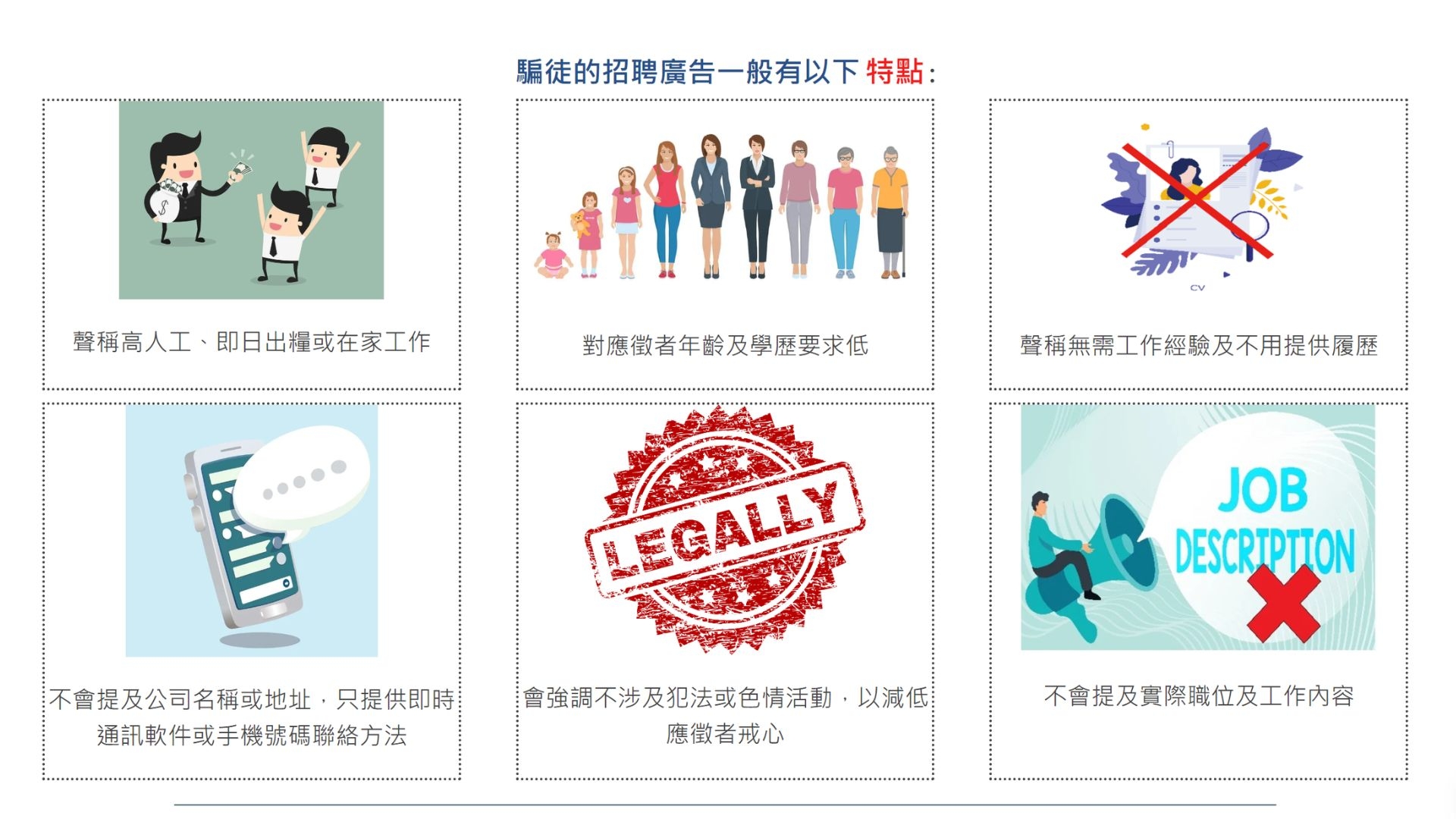 香港職業發展服務處高級項目經理王嘉慧提醒求職者,留意求職廣告是否要求交出個人資料或銀行資料,是否要支付前期費用等,簽約前亦要先清楚合約條款,如對方不願給予合約副本,都屬可疑情況。