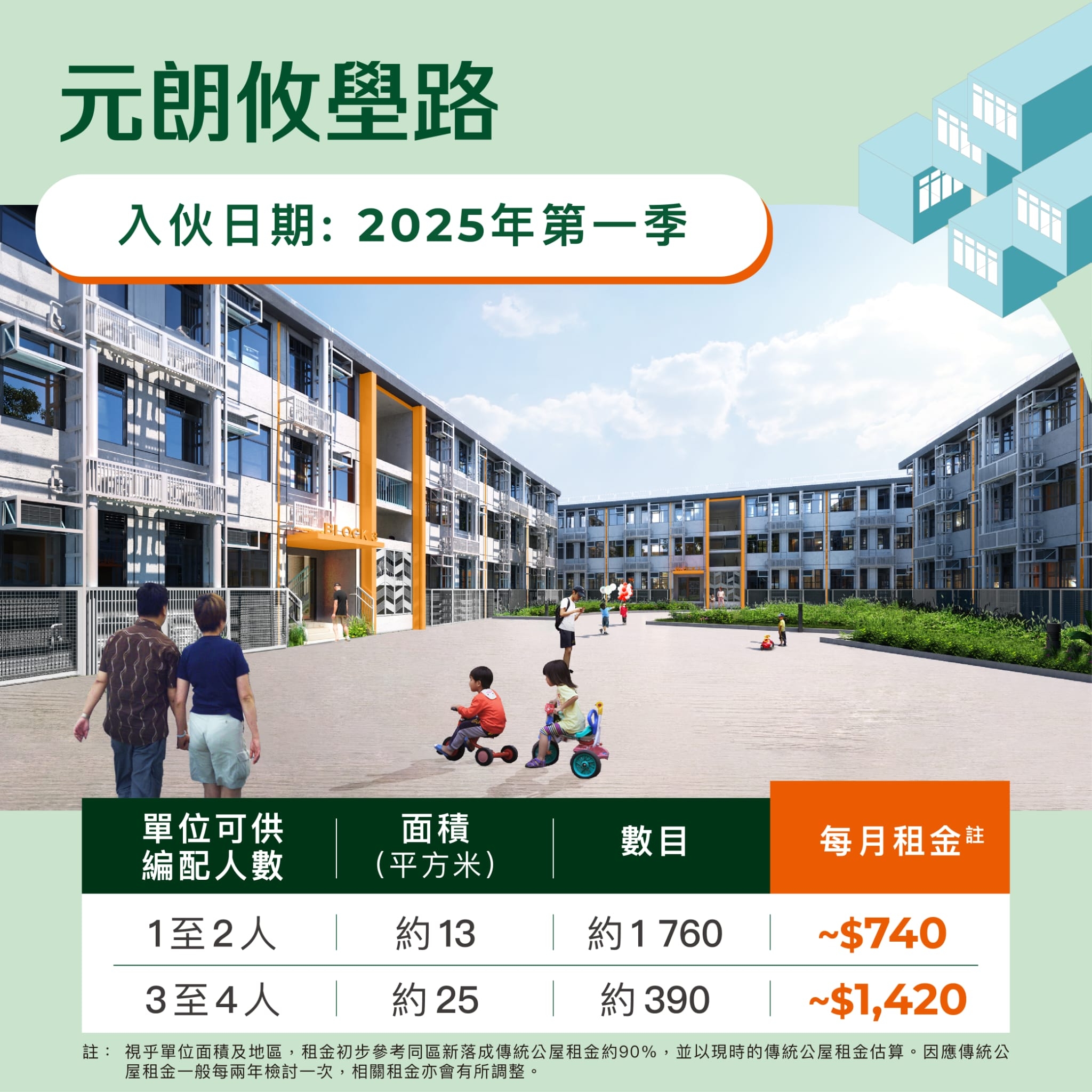 項目位於元朗攸壆路,將提供約2 100個單位,預計明年第一季入伙。在房屋局的指示和監督下,營運機構未來數月須全力做好前期準備工作,確保順暢處理住戶申請及入住事宜,並在入伙後隨即為住戶和地區提供各項服務和配套設施。