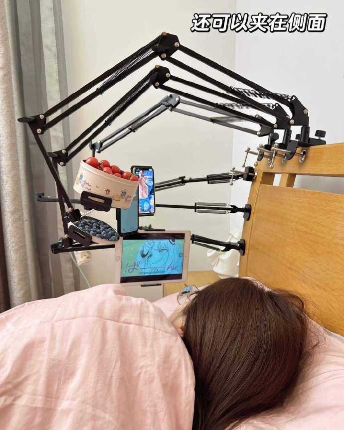 近日一位女子曬出幾張照片, 因為外面天氣轉冷,所以特意設計與一張「懶人床」,床邊掛有六個支架,分別放上平板電腦、兩部手機、藍莓、小番茄及奶茶。貼文一出引來網友熱議「我還以為他在Icu喝著奶茶呢,我還鬱悶怎麼醫院這麼的不負責」「一看以為在icu」「再插枝尿管就完美了」「我以為全癱」「八爪醫師的太太」「冬天的理想生活方式」「殘廢餐」「奶茶放得太高了,會一直往下灌。建議放到低於臉部的位置。」