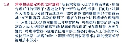 根據港鐵規定,港鐵設有「乘車超過限定時間之附加費」,所有乘客進入已付車費區域後,須在合理可行的情況下,盡速登上第一班到站的列車前往目的地,並須在入閘後150分鐘內完成車程,然後通過出閘機離開已付車費區域;乘客在沒有合法授權或合理解釋下,未能於150分鐘內離開已付車費區域,可被徵收相等於當時最高額之成人或特惠單程車費作為附加費。![]()