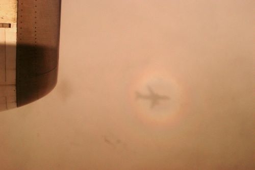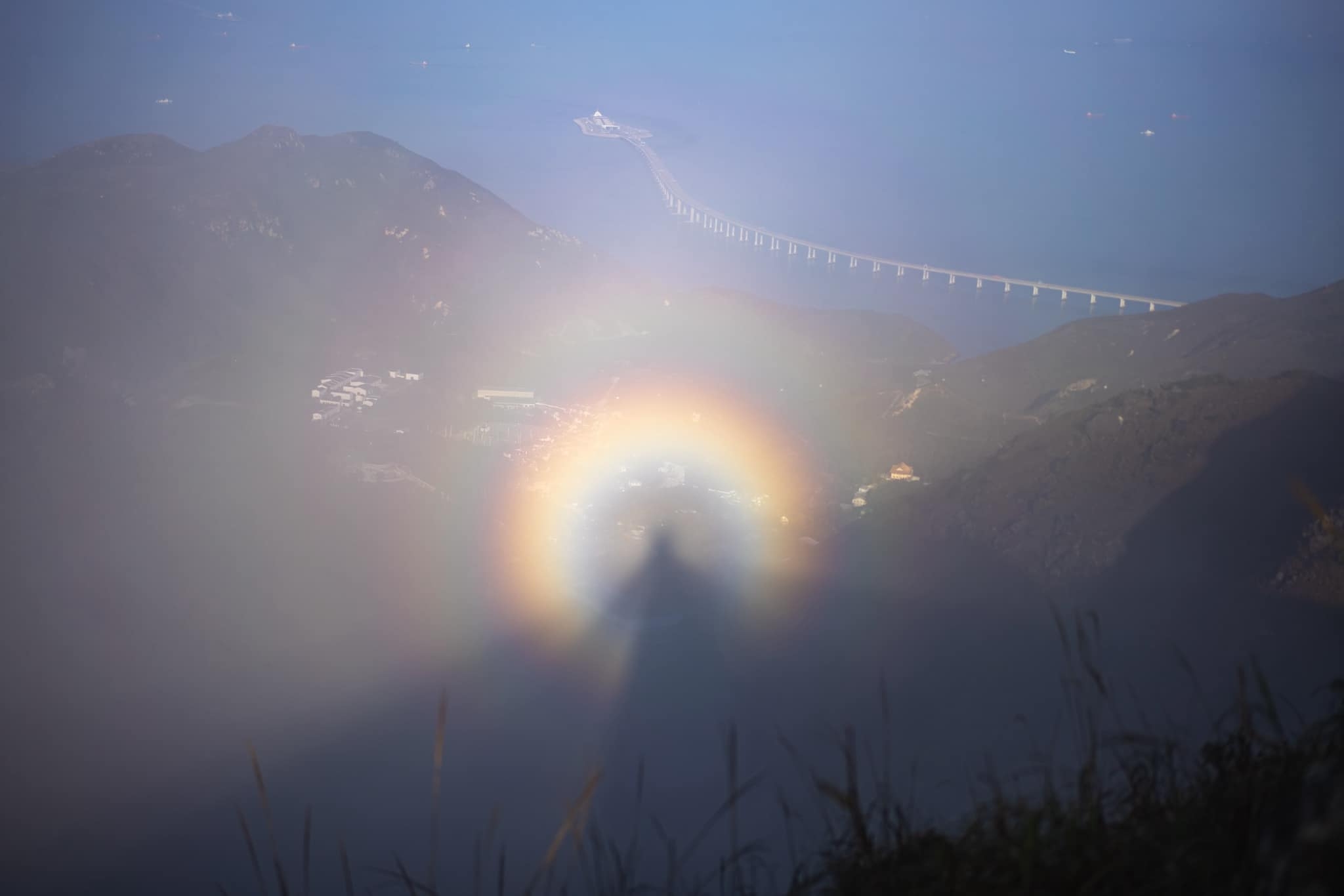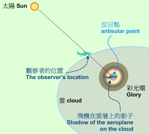 天文台網站特別解釋,呢個現象叫做「彩光環」或稱「佛光」或「寶光」,「當你企喺高地,太陽由背後照射過來,影子就有機會投射喺山腰嘅雲霧上,陽光經雲霧嘅水滴反向散射,就會產生一組彩光環包圍住影子。呢個現象要喺高處向下望向對正太陽嘅反日點先會見到,有時坐飛機向下望,都會見到飛機嘅影子喺雲層上被彩光環圍繞㗎」!![]()