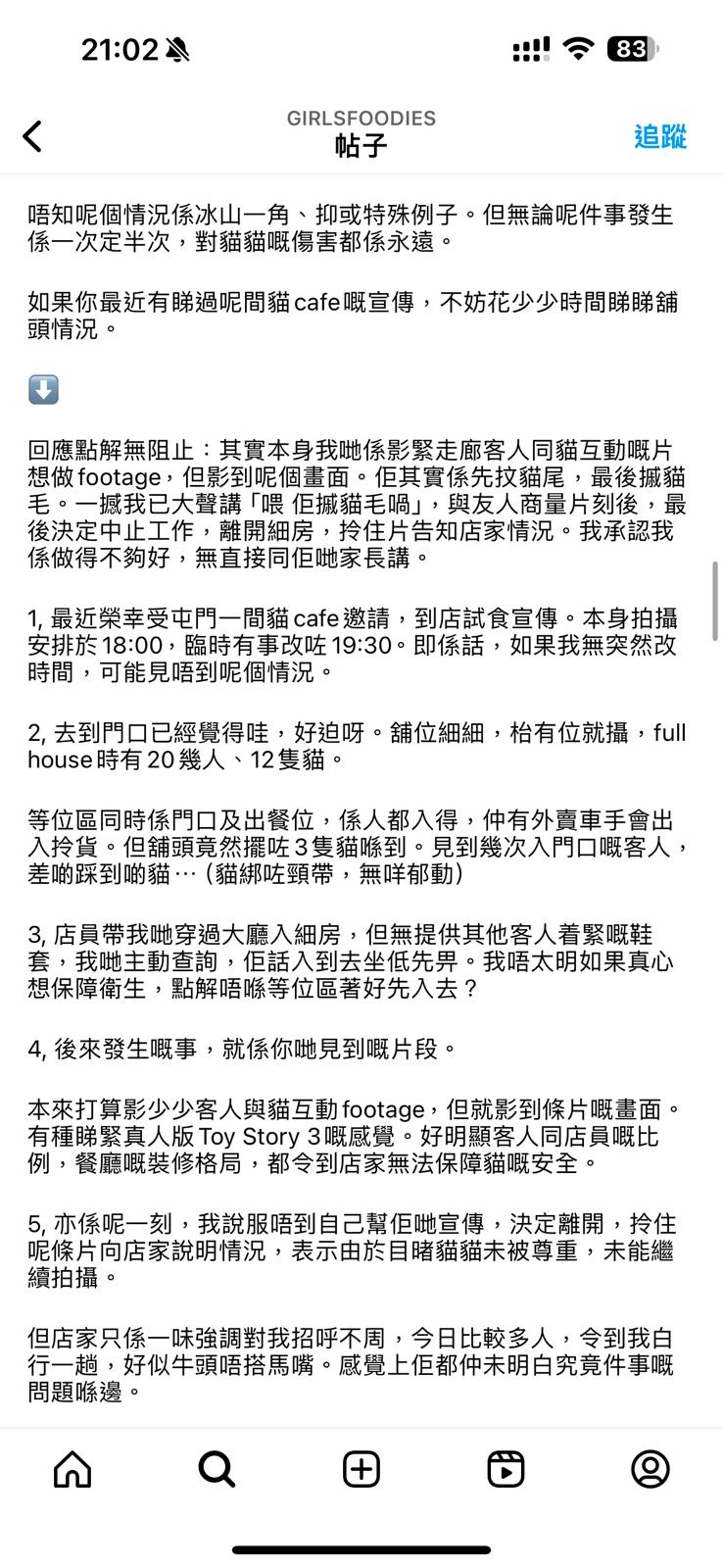 據該博主講述,這間店鋪存在「鋪位細細,12隻貓」、衛生條件差「無提供其他客人着緊嘅鞋套」、「根本無法保障貓貓」等問題,令博主感受到不適,決定不予合作並提出問題。