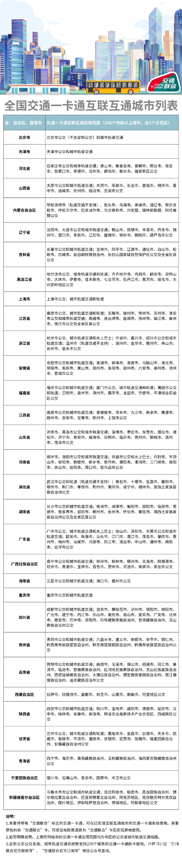 以下為全國交通一卡通互聯互通城市列表: